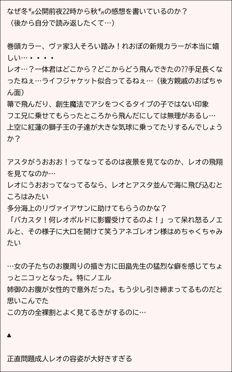 No23☆quiet followMEMO2026.01.04今更秋㌐の感想です。時刻は23:40、あと20分で本誌配信ですほんとは仕事終わってから読むつもりだったけどここまで来たら読んでから寝ますそんなに秋忙しかったか…記憶が…抜けてる… ##本誌感想 show all(+6 images) Tap to full screen (size:1000x1600).Repost is prohibited No23SPOILER2026.01.0526冬㌐感想感想と言うより絶叫感情がまとまらんがマジで寝る、残りの感情明日消化するPASS:20260105(配信直後の投稿なので、うっかり開くの防止でPASSつけてます) 7 No23MEMO2026.01.04今更秋㌐の感想です。時刻は23:40、あと20分で本誌配信ですほんとは仕事終わってから読むつもりだったけどここまで来たら読んでから寝ますそんなに秋忙しかったか…記憶が…抜けてる… 7 No23DOODLE20251214 🍀学園、8Pの漫画を描きたいのでレオは原作参考にしつつ設定ラフ2歳差、同じ高校に通ってたとして1年しか重ならないのか…そうか… No23DOODLE20251214 こっちよりもこっちという絵(個人の趣味)㌐2024springの🃏集合絵、王族版で見たかったけどこの2人🐰カチューシャがそもそも付けられんくない??という気づき 2 No23DOODLE20251211 らくがきつめつめ①レオソリ②ソリ③年間執筆文字数えげつない事になってたよって日記(公開案内)OTP23日目まで公開しましたhttps://privatter.me/user/EJoN_SC?category=88587 3 No23MEMO2025.11.25 日記、あまり二次元に関係はない。絵を描く体力が残ってないからメモ書き 2 recommended works YyyeastDOODLE🎸🗡️我不觉得有多r18,但是还是设定了密码18↑?y/n 2 NNNMEMOヴァイキング(元ネタ)的価値観がカミュに影響してたら、と仮定してメモした妄言、バイキングについての情報整理、そのほか妄言※作中バイキングとヴァイキングを混同している※全部「そう(↑)仮定したらこうかもね」の話・シンボルに海の要素入ってるからカミュの構成要素として大きい存在だろうよと思って・カミュはバイキングの事を良く思ってないけど、それはそれとして…のテンションで見てほしいタイプの妄言 7890 sirokumagorouDOODLE最近流行りのゆっくすりのデリケートゾーン構造がどうしても気になって…こんなかな、という落書きです追加は保護施設でゆっこん・ゆんぎに異様に懐かれ赤ちゃんゆっくすりやゆんぎを見て見てされつつ遊ばれる職員・坂下さん(元警備員)18↑? y/n 2 SiropCAN’T MAKE enbidemonai_666PROGRESS出すか分からない新刊案さめしし 6 CutterDOODLE少年デx 初期テ 22 yatagarasu0409DOODLEいわひらじ、1周年でした!!🎉※トレス素材お借りしてます※ Hiiragi_syuu_22DONEしのんのテスト歌枠の合作のイラストです 4 kaiware_radishyDONECoC - マインドイーター / /KP - しおたろPL - カヲルさん- - END・両生還 - -ありがとうございました!「なんすか色々って〜!あ、お小遣いの件、ほんと頼みましたからね!ついでに膝枕も!」