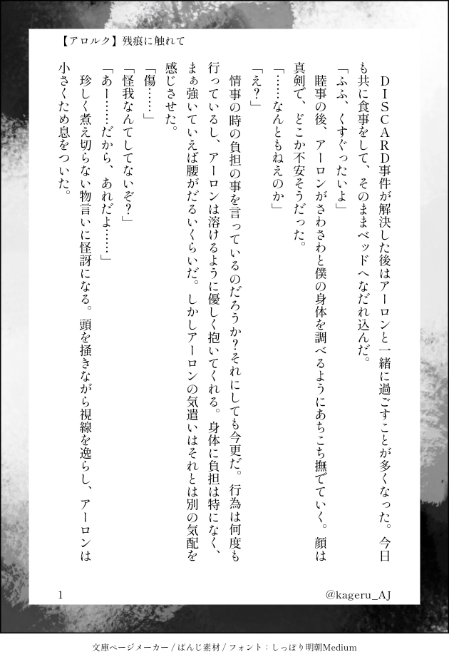 かげる☆quiet followREHABILI【アロルク】残痕に触れて【お題】傷跡エンド後。ルークの身体の傷とアーロンの心の傷。#アロルク深夜のワンドロワンライ祭り #アロルク allRounder show all(+2 images) Tap to full screen (size:630x928).Repost is prohibited Let's send reactions! freqpopularsnackothersPayment processing Replies from the creator Follow creator you care about!☆quiet follow かげるMOURNING遠い昔に書いたTOAのジェイルク、逆行ネタの序章。続かないけど脳内にはある。 4 かげるSPOILER【エド&ジェイ】揺籃アナザーEND後、初期の腐ってない生存ジェイスンif 。カプ要素はないと思う。ネタバレ注意。フルコン後推奨。幻覚です。 2 かげるREHABILI【アロルク】残痕に触れて【お題】傷跡エンド後。ルークの身体の傷とアーロンの心の傷。#アロルク深夜のワンドロワンライ祭り 3 かげるREHABILI【アロルク】誓言【お題】プロポーズエンド後。#アロルク版深夜の創作60分一本勝負 5 かげるREHABILI【アロルク】「かわいい」は注意ルークが幼い頃怪しい男にナンパ(?)された小話。半実録。わたしが子供の頃体験したことをルークに体験させたかっただけ。アロルク要素薄いけどアロルク前提のつもりです。謎時間軸。 4 かげるREHABILI【アロルク】酩酊独占欲【お題】お酒、嫉妬ちょこっとモブ男出てきます。#アロルク版深夜の創作60分一本勝負 6 related works kacyou_keylockDONE #アロルク版深夜の創作60分一本勝負『学パロ』で参加します。本編のネタバレっぽいのや色々混沌としてるのでワンクッション。にぎやかです。主に前半が。 6 もだえDONE完成)アロルクエロ漫画完成しました!お寿司だけでなくいろいろな食べ物スタンプをお与えくださりありがとうございました!描きたいものいっぱいあって大変ですが、この後日談もいつか描けたらと思って描き留めてあります。 27 bezel_arlkDONE捜査中キスしないと出られない部屋に閉じこめられた未満アロルク漫画 やおいです 8 もだえDOODLEアロルク。名前の話。どちゃクソネタバレあり。らくがき顔漫画 5 cottonpiricaDOODLEワンドロお題で学パロ(アロルク♀)ルク♀なのでワンクッション。ヤンキーと優等生という王道も好きだし、幼なじみ設定も好きだし…とアレコレしてたら何故かルークに女子の制服着せてた…。金髪ショートの女の子が好きな所為かな。。。 水無月SPOILERワンクッションお試しも兼ねて。ミッション17辺りのネタバレ自宅アロルクif設定(※そしてこの設定の一部から派生した、友人作の青年ルクヒロ初夜翌日話(その節はご馳走さまでした…!)→https://poipiku.com/IllustViewPcV.jsp?ID=2082911&TD=4038445 3 おののぽてこDOODLEアロルク3本繋がり/豆まき/マーキング 5 1hF4nlDOODLE※女体化※フォロワーさんが誕生日お祝いに書いて下さった素敵小説の感想絵です。本当に可愛くて読むと幸せになれるお話なのですが、私の乏しい画力ではとてもその可愛さを表現できませんでした…。 うーだらりSPOILER続きが書けなかったんだけどエンド後の…アロルク…?このあと記憶喪失になったルークに翻弄されて最後のコマみたいな顔するアーロンがいっぱい出てくる漫画読みたいです、導入はフリー素材だから続き欲しい 2 recommended works kimadosukoiSPOILER転生系現代パロなアロルク前世じゃすごく格好良かった元相棒が、自分より大分歳下で生まれてきたあげく、無邪気に慕ってくれるのが嬉しすぎてついお兄ちゃぶってたら噛まれた年上ルークの話※子アロ容姿バレ 4 mzzzkkkDONE『ジェスチャー・ゲーム』ワンドロに投稿したものです。ジェスチャーゲームで調べたら犬種縛りって出て来たのでつい…難易度高くない!? 3 mzzzkkkDONE『闇を駆ける』ワンドロ投稿作品です。相方の武器を使うのはロマンです!!!!一応初期アロルクの設定で書いてます。(あんまりそれ感無いですが) 5 はるきDONE疑似着衣セッ…アロルク…とは…?(描いてて楽しかったです)(大してえろくもないけどシチュがシチュなのでR指定)PASS:成人済ですか?(Y/N) baimai_0108DONE修羅場を乗り越えた友人へバディミと出会わせてくれてありがとう#アロルク※バディミ本編ネタバレ有※越境視聴後推奨 19 ---DOODLE4月14日のアロルクの誕生日記念に描いた漫画です!読む方向は左から右ですありがとうございます。+번역 도와주신 이스리드님 감사합니다! 12 はなこDOODLEアロルク BWaytothedawnINFO12/11東7 K02a Macchinetta 新刊サンプルA5/38p/全年齢 会場頒布価格\500怪盗ビーストの偽物から予告状から届いたのをきっかけとして、警察の恰好で乗り込むふたりの話です。いつものごとく、アロルク要素は超薄いです。ご縁ありましたらよろしくお願いいたします。★BDDhttps://webonly.herokuapp.com/articles/1675 10 類の足ふきDOODLE루이쯔카 4