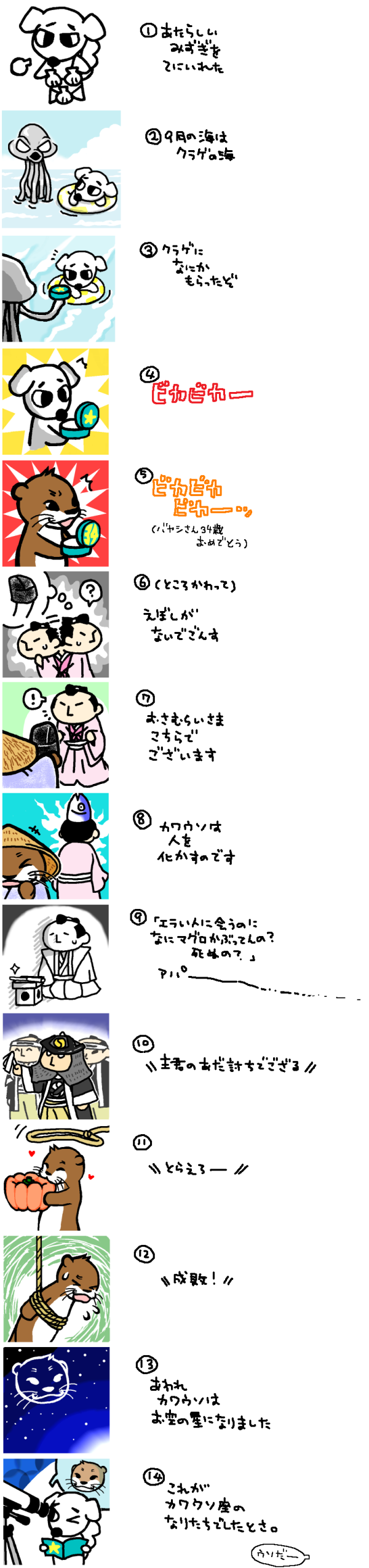 スズキ☆quiet followPAST2012年秋〜冬にかけての連作Twitterアイコンまとめ若林氏の誕生日を挟んでるため⑤でいきなり変身してますこの年の7月の『薄桜記』で春日氏が浅野内匠頭役を演じたため、ほんのりそれっぽいネタが入ってます…が、当然思いつきです(無事にオチがついてよかった) Tap to full screen (size:600x2548).Repost is prohibited Let's send reactions! freqpopularsnackothersPayment processing Replies from the creator Follow creator you care about!☆quiet follow スズキDONEこみゃくって、特徴をミニマルに表現するのにうってつけでは、と思いついて描いたウエランこみゃくこみゃくの目っぽく見えるのは細胞(セル)だから欠けさすのは反則かもですが スズキPAST2012年秋〜冬にかけての連作Twitterアイコンまとめ若林氏の誕生日を挟んでるため⑤でいきなり変身してますこの年の7月の『薄桜記』で春日氏が浅野内匠頭役を演じたため、ほんのりそれっぽいネタが入ってます…が、当然思いつきです(無事にオチがついてよかった) スズキPAST若林氏の最初の著書『社会人大学人見知り学部 卒業見込』発売記念のほぼ日替わりTwitterアイコンまとめ(2013年5月) スズキPAST2012年クリスマスから2013年年始あたりのTwitterアイコンまとめほぼ日替わりで変えていた労力とオチも決めずに描き進めていく胆力、我ながら凄い スズキPASTTwitterアイコン用たりないふたり(2012)山里さん=トド なネタに乗っかってトドとカワウソ(若林氏)ロゴはどうやら当時の公式アカウントで配ってた模様 スズキCAN’T MAKEケラさんとバヤシさん(2017)一回しか(※)会ったことなさそうな組み合わせのツーショも二次元ならできる 上手くなりたい理由だ(※たしかケラさん監督の『罪とか罰とか』のPR担当みたいなのをオードリーがやってたはず) recommended works L_tw_slMOURNINGhttps://x.com/L_tw_sl/status/1779268490299617608立ち食いそばーちゃーで鯖槍弓工口。あんまり気持ち良さそうではないけど、糖度はいつも通り高め。時間かけすぎて良く分からなくなってきたので供養です。 2397 MillNataDONE『Salvation ~出会い side N~』 3 CVYqbtWiaMCuvKCDOODLE1月号ネタバレ注意AI🐳で🐳📱🤕pass:🤕くんの出身地 3 asterism_uDOODLE猎人协会live回放 9 ㌥❤︎㍑DOODLE🌾監督の新作ネタバレ注意(イベントの記憶を掘り起こして描いた絵) hiyo_rukaSPOILER快刀乱魔 現行・未通過❌ 同卓❌落書きなどのまとめ 字が汚ねぇです 6 popopochidayoDONE立ち上がったおにぎり神 4 もくまるDOODLE【幕間】🤍💧+💧の描ききれなかった補足のようなアレです〜!1枚目の表紙の作品の続きになってるので単体では読めないかも 6 NAKAYOQ_yDOODLEプルハルまとめ 6