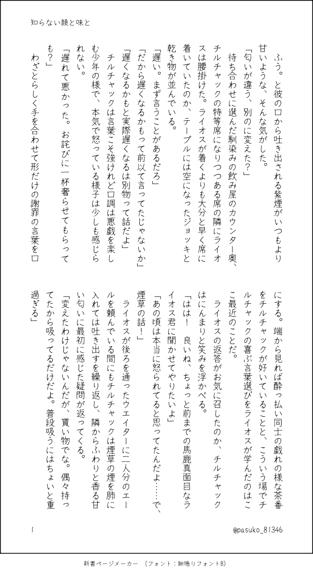 pasuko_81346☆quiet followDONE知らない顔と味と色々ご都合設定、本編開始前イメージ付き合ってないライチル show all(+5 images) Tap to full screen (size:618x1132).Repost is prohibited Let's send reactions! freqpopularsnackothersPayment processing Replies from the creator Follow creator you care about!☆quiet follow pasuko_81346DONE蜜月は三十分だけ②ライチル 学パロ続いた。次の約束をする二人 6 pasuko_81346DONE蜜月は三十分だけライチル 学パロチルチャック先輩とライオス後輩が出会う話続くかもしれない 11 pasuko_81346MENUおいてけぼりのその後は1/12のスパコミで頒布予定の『おいてけぼりの僕たちは』に収録する書き下ろし分のサンプルになります。『おいてけぼりの僕たちは』の後日談となる為、未読の方はポイピクで全文読めるのでそちらから読んで頂ければ。 13 pasuko_81346DONE来年は甘さ控えめでライチル二人でチーズケーキを焼く話ライオスお誕生日おめでとう! 25 pasuko_81346DONE芸術鑑賞のすゝめライチル※CP要素ほぼなしモブがすごい喋る。色々捏造設定絵画の押し売りに遭いかけるラの話、チの口がえらく回る 6 pasuko_81346PROGRESSこの気持ちをなんと訳そうか(仮)現パロライチルチルが翻訳家、独自設定有うまくいけば1月のイベントに出そうとしてるやつ 11 recommended works DontmindmeDOODLE弓鄭成人yes/no z_n_jinDOODLE毒入りスープ現行未通過❌高校生かわいいねpass:y 2 arai1kabePASTフォロワーの絵柄を描かせてもらって、また自分の絵柄で描いてもらって、自分の絵柄ってどんななんだってなったのでまとめてみた。横顔と笑顔が一番特徴でるのかなぁと。耳の描き方もいつも同じ。リンクでさえ毎回描いてる顔違う・・・(1人前世混じってる)見れば私の絵だなとはわかるけど、ジャンルごとでもまた変わるので描き分けをしている、とポジティブにいこうと思いました。 3 guren_tadatoshiDONECoC 私立天柱学園神話自衛委員会 HO4塩飽 奏多遠野シロ 様(@noct_TRPG)に描いて頂きました! 藍宮アサギDOODLEセスアキ。事あるごとにアキラからグイグイ近寄っててほしいしセスは戸惑いながらも受け入れててほしい…!!! ハナハッカDOODLEぼいどげんみ❌ 強めの妄想 namaDONEうちのこまとめ3 6 @TASUKU_ariumPROGRESS172🔸描いたら引ける...うん正解 lala_lilasDONEおめでとう ありがとう……