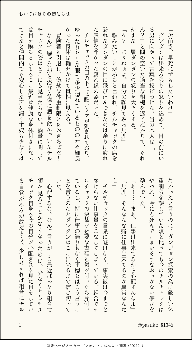 pasuko_81346☆quiet followDONEおいてけぼりの僕たちは④ライチルダンダンがあれこれする話。・本編終了後の話の為アニメ勢の方ご注意下さい。・当方原作、バイブル、デイドリ履修済です。 show all(+14 images) Tap to full screen (size:618x1132).Repost is prohibited Let's send reactions! freqpopularsnackothersPayment processing Replies from the creator Follow creator you care about!☆quiet follow pasuko_81346DONE蜜月は三十分だけ②ライチル 学パロ続いた。次の約束をする二人 6 pasuko_81346DONE蜜月は三十分だけライチル 学パロチルチャック先輩とライオス後輩が出会う話続くかもしれない 11 pasuko_81346MENUおいてけぼりのその後は1/12のスパコミで頒布予定の『おいてけぼりの僕たちは』に収録する書き下ろし分のサンプルになります。『おいてけぼりの僕たちは』の後日談となる為、未読の方はポイピクで全文読めるのでそちらから読んで頂ければ。 13 pasuko_81346DONE来年は甘さ控えめでライチル二人でチーズケーキを焼く話ライオスお誕生日おめでとう! 25 pasuko_81346DONE芸術鑑賞のすゝめライチル※CP要素ほぼなしモブがすごい喋る。色々捏造設定絵画の押し売りに遭いかけるラの話、チの口がえらく回る 6 pasuko_81346PROGRESSこの気持ちをなんと訳そうか(仮)現パロライチルチルが翻訳家、独自設定有うまくいけば1月のイベントに出そうとしてるやつ 11 recommended works shidoriDOODLEすけべな雰囲気なだけのイザディア……パス→18⤴︎︎︎?(yes or no) 2 BUKUノ院ミギマガリ君DOODLEマの黄金の手と🈂️🔞BL マモサタ18↑yes/no 4 ChemicaltrapMEMO 13199 わるもぐらDOODLE自主練落書き(1) 中身がやらかした時と終わりを悟った時 2 tigrisleoDOODLE🚥🐰🎩3️⃣イチャイチャ2024年9月畫的 3 yugureapplepieDOODLE越前の街道沿い 9 hajisiri_akaSPOILERリョナ好き目線で見た感想です。ネタバレを大いに含みます事故を防ぐためパスワードを設定してます。パスワードは公開日の数字4桁です。 237 konnyanoyuuhannMEMO投げ捨て 429 momijiDONEかさみつ5サークルカットを描いているときに思いついたナルミツ漫画です。あたまのゆるいパロディネタです。※1枚目が元ネタ(?)のサークルカット絵です。 4