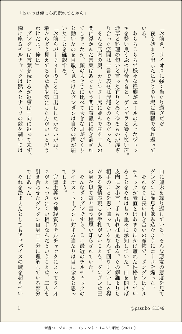pasuko_81346☆quiet followDONEあいつは俺に心底惚れてるからライチル+ダンダン台詞リクエスト貰って書いたやつ付き合ってないライチルに振り回されるダンダンの話 show all(+4 images) Tap to full screen (size:618x1132).Repost is prohibited Let's send reactions! freqpopularsnackothersPayment processing Replies from the creator Follow creator you care about!☆quiet follow pasuko_81346DONE蜜月は三十分だけ②ライチル 学パロ続いた。次の約束をする二人 6 pasuko_81346DONE蜜月は三十分だけライチル 学パロチルチャック先輩とライオス後輩が出会う話続くかもしれない 11 pasuko_81346MENUおいてけぼりのその後は1/12のスパコミで頒布予定の『おいてけぼりの僕たちは』に収録する書き下ろし分のサンプルになります。『おいてけぼりの僕たちは』の後日談となる為、未読の方はポイピクで全文読めるのでそちらから読んで頂ければ。 13 pasuko_81346DONE来年は甘さ控えめでライチル二人でチーズケーキを焼く話ライオスお誕生日おめでとう! 25 pasuko_81346DONE芸術鑑賞のすゝめライチル※CP要素ほぼなしモブがすごい喋る。色々捏造設定絵画の押し売りに遭いかけるラの話、チの口がえらく回る 6 pasuko_81346PROGRESSこの気持ちをなんと訳そうか(仮)現パロライチルチルが翻訳家、独自設定有うまくいけば1月のイベントに出そうとしてるやつ 11 recommended works ドア畑DOODLE 藍宮アサギDOODLEセスアキ。事あるごとにアキラからグイグイ近寄っててほしいしセスは戸惑いながらも受け入れててほしい…!!! lem927DOODLE namaDONEうちのこまとめ3 6 L捏~DOODLE あまねコハクDOODLE甘音楓×こはくちゃん 日常logです。今回パンケーキ一緒に作って食べようってなったのに、我慢ならずパンケーキを焦がすところでした笑右下の絵はlog関係なく、出来心で描きました。えっちです。 ラテ茶DONE🎀🦇 __LoVE__Me__Do_DOODLE드림주유혈 2 かのこDOODLEデフォルメ🧪