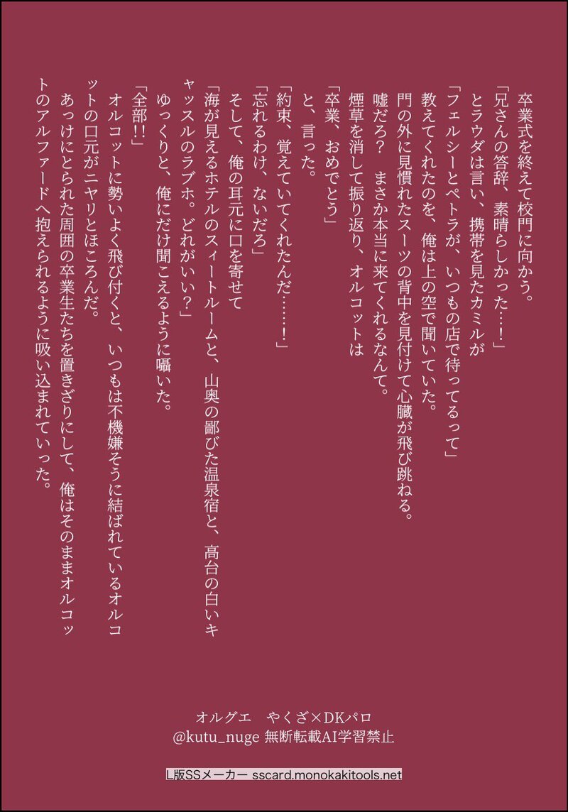 kutu_nuge☆quiet followPAST★2511105作目追加しました!★251109 #いいねされた数だけ書く予定のない小説の一部を書く現パロや異世界パロを中心に現在4作UPしております。すこしずつ書いていきますので少々お待ち下さい。古↓新 #オルグエ show all(+5 images) Tap to full screen (size:954x1365).Repost is prohibited Let's send reactions! freqpopularsnackothersPayment processing Replies from the creator Follow creator you care about!☆quiet follow kutu_nugePAST★2511105作目追加しました!★251109 #いいねされた数だけ書く予定のない小説の一部を書く現パロや異世界パロを中心に現在4作UPしております。すこしずつ書いていきますので少々お待ち下さい。古↓新 6 kutu_nugePAST空に光るはすべて星 162〜170🧦の、たまに更新するオルグエ140文字SSのログ置き場です。あいだに連作の#4と#5が入ったのでずいぶん飛び飛びになってしまいましたが、今後も思い出したように更新したいと思います。 2782 kutu_nugePAST本日09日はオグの日なので、『オルグエペーパーアンソロ星願2025』で発表したオルグエ庭師×坊っちゃんパロをこちらにも上げます。(ペーパー企画アンソロありがとうございました!楽しかったですー!)※モブグエ要素があるので苦手な方はご注意下さい。でも、オルグエです!!それでも読んでみますか?yes/no 2424 kutu_nugeMEMO自分でも驚いていますが、ひとを選ぶ方向に進んでしまったのでワンクッション置きます。オルさんが見た夢の話で、グエスレが出てきます。それでも読んでみますか?yes/no 747 kutu_nugePAST空に光るはすべて星 151〜161#一番星とともに #オグフェス15話二周年記念企画にて、15話のオルさんとグエくんを私なりに10日かけて振り返ってみました。※おまけで16話エピソードも入れています。お祭りを企画して下さった「一番星とともに 」@2nd0423 様、本当にありがとうございました!楽しい企画盛り沢山で、一週間毎日楽しかったです!! 3378 kutu_nugePAST毎月09日はオグの日で、5月9日もオルグエの日で呼吸(59)の日!上手く呼吸が出来なくなってしまうCE0のお話です★一年間、オルグエの日更新お付き合い下さってありがとうございました!! 2274 related works kutu_nugePAST★2511105作目追加しました!★251109 #いいねされた数だけ書く予定のない小説の一部を書く現パロや異世界パロを中心に現在4作UPしております。すこしずつ書いていきますので少々お待ち下さい。古↓新 6 touge_trpgDOODLE #いいねされた数だけ書く予定のない小説の一部を書く で書いたり発掘してきたやつ。とても尻切れとんぼ。 1042 recommended works eibonbonsDOODLE御沢 🙇♂️ 春草🌿DONE右グエオンリーイベント用にいただいたお題、髪下ろしグエくんの新婚生活、お相手は誰でも、とのことでしたのでオルグエにしてみました。夜のお誘いバージョンです。あまりエチくなくてすみません…イベント終わったので鍵を変更しました。鍵用質問、あなたは18歳以上ですか? 春草🌿DONEゆるぐえ用にいただいたお題、髪下ろしグエルの新婚生活、です。せっかくなのでオルグエで。現パロ風にしてみました。楽しく描けましたー!お題ありがとうございました♪ ktkr45_great12DONE「何かしらのショックで物を深く考えてられなくなって一人で生きていけなくなったグエを保護するオルさん」と言う俺だけが楽しいシリーズなオルグエ設定はふわっとしか考えていません。時々シリアスみたいなそれっぽい事書いてるけどふわっとしか考えていません。とにかく二人のゆるゆる日常が欲しくて書いてます。 2640 BoubouDOODLEラウグエのような…オルグエのような… kikigakkgDOODLEオルグエ車描けなさすぎてオルグエカーセックス描けねぇ💢 亜乃🌈INFO仲良しのぼんずさんが誕生日プレゼントにオルグエ描いてくれましたー🎁しかもわたしの本のLeoLeoLandのレオグエくんで😍もう表情が甘ったるくて可愛くてえっち…無防備なポーズ(たまらん!)オルさん…この子好きにできるの?え?ずるい!!ぼんずさんは私が知ってる限り最も可愛くてえっちな身体を描かれる天才さんです👏✨️ありがとう🥰 おもちDOODLEク、クズだー! cor_ponPROGRESS手ブロでらくがき中の謎時空オルグエ