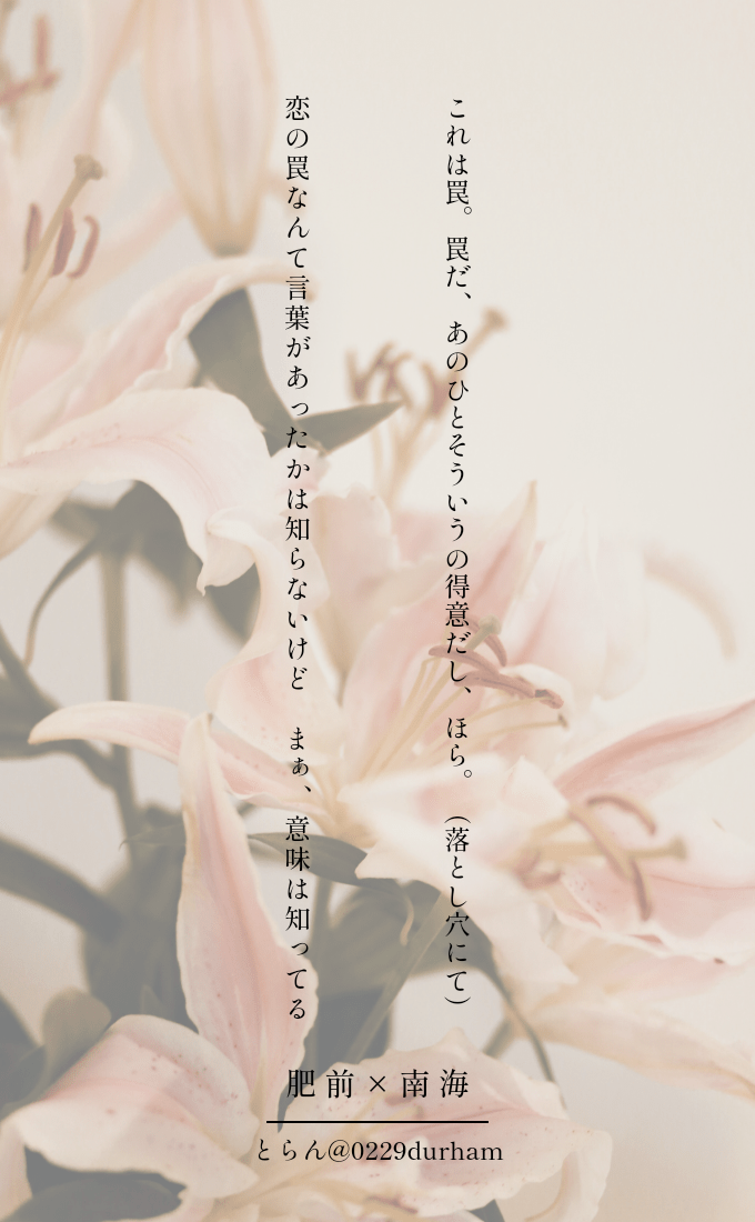 杜蘭―とらん―☆quiet followDONE肥前×南海―弐―『罠』 #ひぜなん princess Tap to full screen (size:680x1100).Repost is prohibited Let's send reactions! freqpopularsnackothersPayment processing Replies from the creator Follow creator you care about!☆quiet follow 杜蘭―とらん―TRAINING小豆長光×山鳥毛で三十一文字🍡🦅文字からわかる通り全て小豆さん視点です。何百年経ってもここで待っているそれは君への愛で、決意だいい香り大さじ1のブランデー君が喜ぶケーキを焼こうかもう一度逢えたね次は離さない私は強く大きくなったぞ宿り木の下で出会った銀色の小鳥よいつか私とキスを朝焼けの終わりの色が君に似て綺麗だな嗚呼早く帰ろう 杜蘭―とらん―DONE肥前×南海―弐―『罠』 杜蘭―とらん―DONE南泉×山鳥毛―弐―『心中』、『紅葉』、『距離』、『恋煩い(山鳥毛)』、『恋煩い(南泉)』 杜蘭―とらん―DONE土佐組(CP要素なし)①5月13日(土佐の日)に投稿した二首②祝杯グラスを購入した記念に詠んだ三首 2 杜蘭―とらん―DONE南泉×山鳥毛①お題に沿った五首右から『桜吹雪』、『遠征』、『目白』、『赤い糸(二首)』②お題『紅』で三首③~⑦Xダグ企画 # 日日是にゃんちょも からお題『ないしょの話』、『手を引いて』、『ホントの話』、『夜明け』、『愛してる』 7 杜蘭―とらん―DONE肥前×南海①お題から五首『刀解』、『書庫』、『ポスターカラー』、『辞書』、『闇堕ち』②お題から五首『赤い糸』、『傘』、『アイス(二首)』、『心中』③短歌集から五首『変化(二首)』、『お花見』、『夜』、『逃避行』④短歌集から四季をテーマに四首 4 related works ムットDOODLEひぜんくんがいい思いするタイプのひぜなん(ちょっとはだけてる) 5n_nya9DOODLEよくない通常ひぜんくんに誘…監…されるケモケモ先生3.7更新完結18↑?(yes/no) 9 杜蘭―とらん―DONE肥前×南海①お題から五首『刀解』、『書庫』、『ポスターカラー』、『辞書』、『闇堕ち』②お題から五首『赤い糸』、『傘』、『アイス(二首)』、『心中』③短歌集から五首『変化(二首)』、『お花見』、『夜』、『逃避行』④短歌集から四季をテーマに四首 4 Tamakazula_choDOODLE人魚パロひぜなん ふわっとなんでも許せる方向け 2395 eiko_dsfDOODLEひぜなんのえちち描きたかっただけ。 杜蘭―とらん―DONE肥前×南海―弐―『罠』 eiko_dsfDOODLE8/1はおっぱいの日で母乳の日で8/2はパンツの日でバニーの日なので全部入れましたw先生のおっぱい吸いながらちんちんいい子♡いい子♡されてる肥前くん大好きなのです。 uru_honmaruDOODLE例のセーター🐑 eiko_dsfDOODLEいいおっぱいの日だから授乳ひぜなん。 recommended works Saw2647PAST文鳥毛(個人的には「ぶんちょも」呼び派)とあずちょも。余談としてはこのぶんちょもさんは本人の鳥の姿ではなくちょもさんの眷属 ゆゆ。DOODLEあずちょも習作 いなばリチウムDONE肥南と主へしとむつんば要素を含みます(混ぜすぎ)タイトル通りひぜなんにちょっかい出すというか巻き込まれた主へしとむつんばの話。 7942 eiko_dsfSPOILER肥前くん中の人イベント昼の部の朗読劇がこんな感じだった(腐視点脚色あり)ちょっと取り急ぎな落書きなので後日ちゃんと書きおなしたい。あの朗読劇、全員裸ってことだもんなと途中で思ってしまって冷静に聞けなかった。後で配信買う。 eiko_dsfDOODLEサウナ好きな南海先生と同じ本丸の肥前くんとサウナ好き別本丸肥前くんの話をずっと悶々と考えている(某イベントのネタとあまり関係ないようなそうでもないような気もするからとりあえずワンクッション)なんか肥前くん(×2)×南海先生いいなってずっと思ってて。でも別本丸肥前くんはちょっと大人な(お姉さん)南海先生とくっついてほしさもある。 2 hznn_sunaDOODLEひぜなんちょっといかがわしい素直に言うこと聞かれると興奮する肥 2 をまめDOODLE〓💧のアホ話 9 oekaki_amamiDOODLE付き合い始めたら異常なまでに激しいスキンシップをする桜井さんであってほしいし、最初は抵抗する姿を見せるけど徐々になれて気にも留めない希理子ちゃんであってほしい くさったおにぎりって奴DOODLE絵チャまとめ。ポケモンガチ初心者のうろ覚えクイズが楽しかったです。ルカリオとレアコイルが衝撃的だった…… 29