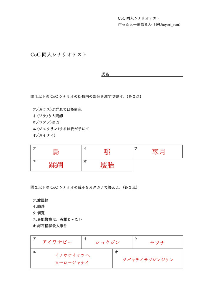Utayori_run☆quiet followSPOILERCoC同人シナリオテストの解答です #クトゥルフ神話TRPG cthulhuMythosTrpg #CoC show all(+6 images) Tap to full screen (size:724x1024).Repost is prohibited Let's send reactions! freqpopularsnackothersPayment processing Replies from the creator Follow creator you care about!☆quiet follow Utayori_runSPOILERCoC同人シナリオテストの解答です 7 related works 10ma10_2sSPOILER共感覚 現行未通過🆖pass→❲y/n❳ みろくDOODLE新しいクトゥルフ探索者新米ぽんこつ大食い鑑識くん 五十嵐PROGRESS みろくPAST1年前に描いた探索者イラストのまとめ 12 八月 真也DOODLE探索者落書き集 15 五十嵐PROGRESS 五十嵐PROGRESS みろくDOODLE我が家の探索者。ファッションデザイナーの白雪逸姫くん。クトゥルフの某シナリオにて触ってはいけないものに2度も触れ、冒涜的な幻を何度も見ることになり発狂。探索者ロストにはならなかったが、半永久的に左足が動かせなくなった。【ナイフの幻影】 2 八月 真也ValentineCoC探索者男子でバレンタイン 10