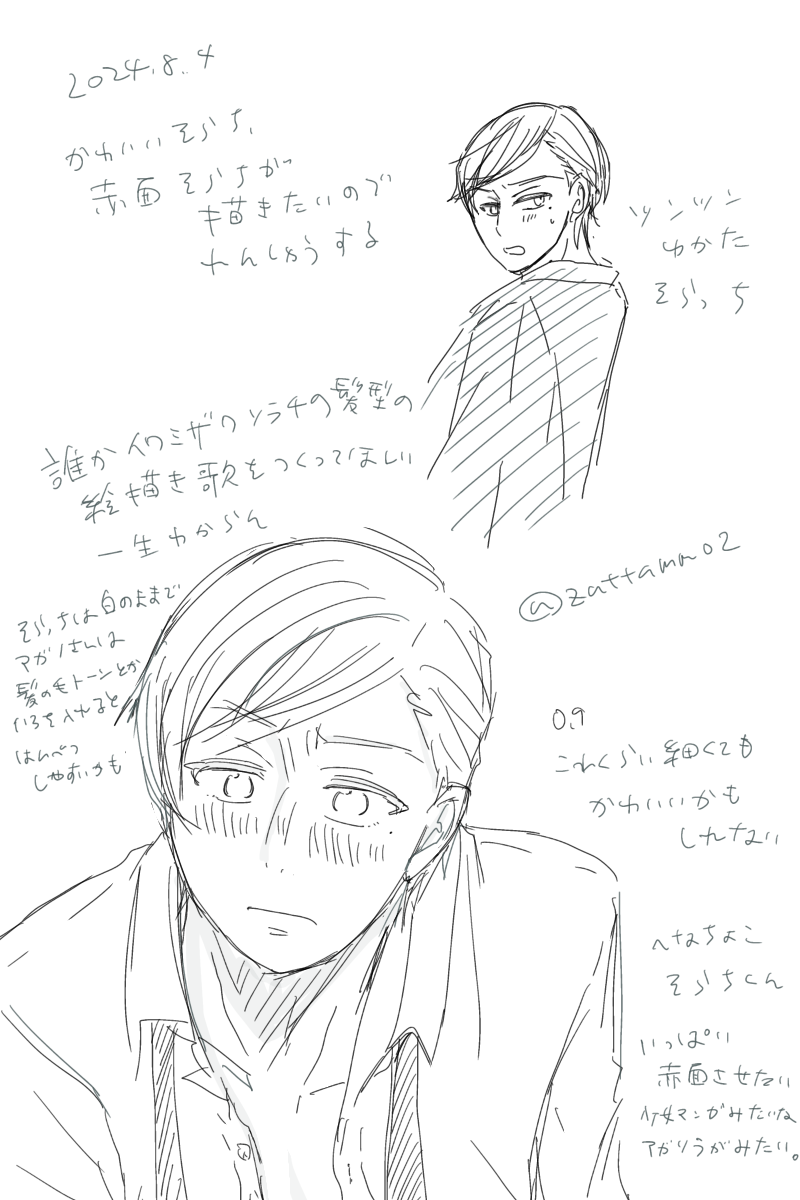 アガソラ描きたくて自分の理想のそらっちが描けるよう練習している。どんどん公式から離れがちだけどそもそも公式もほぼ個人情報が無いのでとりあえずいっぱいかわいくして赤面させたい☺️自分の絵柄も線も迷子なので色々練習したり試してみるー