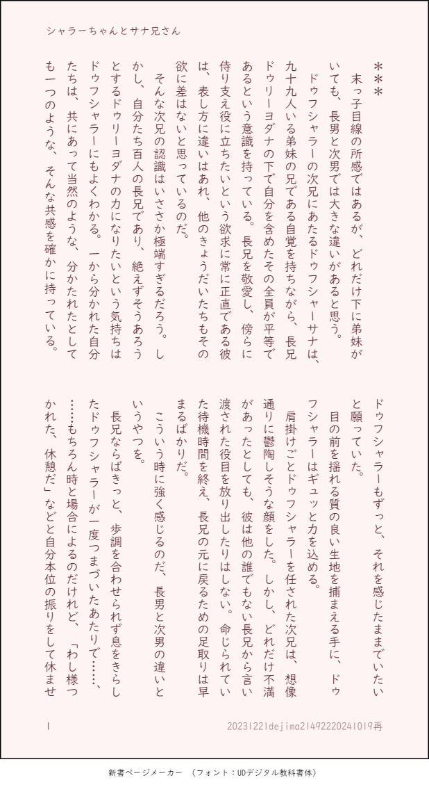 dejima214922☆quiet followPASTシャラーちゃんとサナ兄さん(SS)シチュ不明書きたいとこだけわし様の「服の裾でも掴んでおけ」からの妄想(約1,600字) ##fgo show all(+2 images) Tap to full screen (size:618x1132).Repost is prohibited Let's send reactions! freqpopularsnackothersPayment processing Replies from the creator Follow creator you care about!☆quiet follow dejima214922DOODLE※自分のカルヨダ妄想ポストをらくがき『ビマがちらつき湧いた戦意発散のため走ったカ市場でわし様に「食えれば何でもいいいやしんぼな大食い男に張合う必要はないぞ?いつでもわし様が最高の美食を堪能させてやるからな。これはこの市場で贔屓の菓子だほらあーん」って宥められてから戻ってきたのかもしれないって妄想していい?(2024/08/25)』 dejima214922DOODLEわしさまやがなTⅤ(某つべ番組パロ) dejima214922DONE悪い夢を見たヨをカがなぐさめるカルヨダ(SS)(約1,800字)※ヨの不安を捏造しています 4 dejima214922PASTカルヨダ(SS)(約1,300字)夏イベの布とグラサンヤキモチついでにいちゃつくふたり 3 dejima214922PASTカルヨダ(短文(ヨのセリフのみ)(約500字)DD∃ダナの妄想もしもカからヨへ買ってきた土ばい土産がbbdのコスチューム一式だったら dejima214922PASTカルヨダ(SS)(約2,800字)生前ヨが切った長い髪を貰ったカの思い出話を聞く鱒とヨ 5