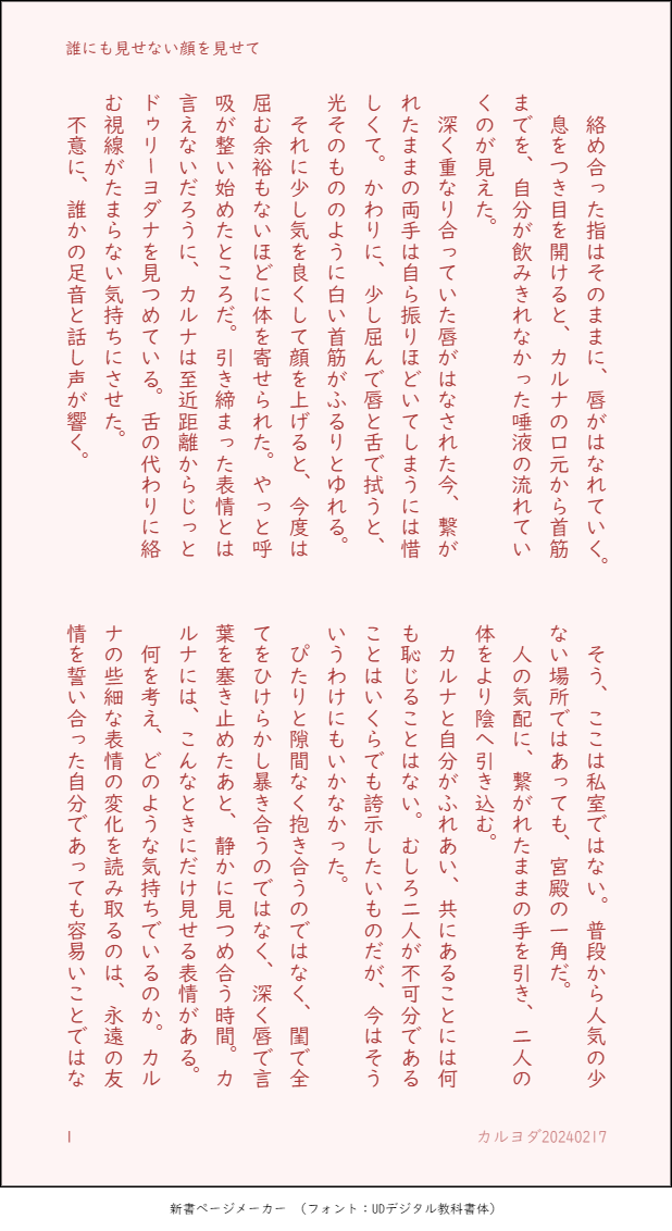dejima214922☆quiet followPAST生前カルヨダ(SS)宮殿でくちづけを交わすふたり初めて書いたカヨなので恥ずかしくて読み返せないと思っていたけれど、あらためて読むと悪くない気がしてきた(約800字) ##fgo ##カルヨダ show all(+1 images) Tap to full screen (size:618x1132).Repost is prohibited Let's send reactions! freqpopularsnackothersPayment processing Replies from the creator Follow creator you care about!☆quiet follow dejima214922DOODLE※自分のカルヨダ妄想ポストをらくがき『ビマがちらつき湧いた戦意発散のため走ったカ市場でわし様に「食えれば何でもいいいやしんぼな大食い男に張合う必要はないぞ?いつでもわし様が最高の美食を堪能させてやるからな。これはこの市場で贔屓の菓子だほらあーん」って宥められてから戻ってきたのかもしれないって妄想していい?(2024/08/25)』 dejima214922DOODLEわしさまやがなTⅤ(某つべ番組パロ) dejima214922DONE悪い夢を見たヨをカがなぐさめるカルヨダ(SS)(約1,800字)※ヨの不安を捏造しています 4 dejima214922PASTカルヨダ(SS)(約1,300字)夏イベの布とグラサンヤキモチついでにいちゃつくふたり 3 dejima214922PASTカルヨダ(短文(ヨのセリフのみ)(約500字)DD∃ダナの妄想もしもカからヨへ買ってきた土ばい土産がbbdのコスチューム一式だったら dejima214922PASTカルヨダ(SS)(約2,800字)生前ヨが切った長い髪を貰ったカの思い出話を聞く鱒とヨ 5 recommended works みDONEダンソニ/🐰の日 おこめDOODLE📿︎︎ ♀いちくだったり、ほかの人もいたりする 12 UORIDONE 七夜翎DOODLE※玄立※后背注意 2 mototo1805DOODLE自己満セルポル。相変わらず余裕ないセルニキと無自覚に兄を煽るポコ。お前だったり、名前だったり読んで欲しくて。 1964 kofigyugi2ndDONE美恋ちゃんのレースクイーンコスプレだよー見せパンだよー!残念でしたー 8 9zyouRemonSPOILER刹夏ネタバレ絵このシーンで1日目セーブなのめちゃ良いなて makot_shinDONE【アキイト】🔦さんの誕生日に間に合いませんでした。誕生日とは名ばかりの告白と花束のお話です。私の好きな花を、📼くんに贈ってもらいたい一心で書いたようなものです。誤字脱字はいつものごとくあると思います……。 5247 rnli64105233DOODLE涂鸦 4