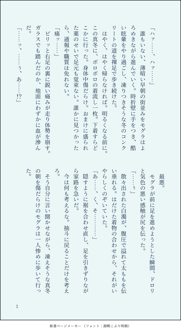 e37c7c160d9b47b☆quiet followDONE前回の厄モグ&モブモグ話の続き。酷い目に遭わされたモグを真木くんが発見する話。R指定なシーンはありませんが、レ◯プ後の事後です。モグが結構酷い怪我してます。ダラダラ長いだけの話。起承転結なんてあったもんじゃない。自己責任にてお読みください。 show all(+32 images) Tap to full screen (size:618x1132).Repost is prohibited Let's send reactions! freqpopularsnackothersPayment processing Replies from the creator Follow creator you care about!☆quiet follow e37c7c160d9b47bDONE前回の厄モグ&モブモグ話の続き。酷い目に遭わされたモグを真木くんが発見する話。R指定なシーンはありませんが、レ◯プ後の事後です。モグが結構酷い怪我してます。ダラダラ長いだけの話。起承転結なんてあったもんじゃない。自己責任にてお読みください。 33 e37c7c160d9b47bDONE•厄もぐ&モブモグのR-18小説(軽くリョナ?)•厄が信者を使って、モブもぐさせる話。ひたすらもぐが酷い目に遭う。•直接描写はモブのみ(厄はしゃべるだけ)•モブ♂×もぐ、もぐ×モブ♀あり(両方もぐがレ◯プされてるだけ)•拘束、酒ぶっかけ、キメセク•閲覧は自己責任にてお願いします※公開制限変えました。問題ありそうなら、消しますPass:18⤴︎(y/n) 24 e37c7c160d9b47bDONE後天性女体化💧のmbr令和長生きおじさん💧が、喫茶店兼怪異専門の探偵などを👁️としていたら、悪い奴らに拉致られて……、みたいな話。途中で力尽きたので、バッドエンドです。すみません。pass:18⤴︎(y/n) 43 e37c7c160d9b47bDOODLEハリポタパロ💧の過去(メモ書き)わかりづらかったので、一応💧の過去をざざっと。ただただ悲惨。詳しい内容は小説化したい(👁️🪨と疎遠になった理由とか)モブ💧注意18⤴︎(y/n) 1618 e37c7c160d9b47bDOODLE︎ゲ謎のハリポタパロ(名前とかイギリスとか丸っと無視。魔法学園というか妖怪学園)•死ネタ•モブ💧注意(匂わせよりちょっと濃い程度)•ただのネタ出し。なのに、最後の方小説形式。全然🔞表現無いけど、念の為パスつけます18⤴︎(y/n) 12920 e37c7c160d9b47bDONEただの様が描かれていた蚕💧に触発されて書きました。👻一家×💧前提モブ💧。💧は、哭倉村帰還後、👁️と再会した時に全てを思い出す→👁️🪨の看病、無事👹出産→👁️🪨が完治するまで👹を預かり3歳くらいまで育てる→無事元の姿に戻った👻家族と共に暮らし、平和な日々を送っていた、という前提です。暴力、レ◯プ表現あり。pass:18⤴︎ 33 recommended works sumodattayo313Reuse Christmas※モブ水です!※ホワイトくりすます!!です!! sumodattayo313DOODLEあほえろ。モブ水っぽい。でもおじはいない、玩具だけ。格好いいすいしんしくんはいない。 sumodattayo313DOODLEモブ水 水吸い水曜日遅刻。ええんや毎日吸いたいから。モブおじおります。 無名さんDOODLEモブ水🔞直接致してる描写は無いけどそういう描写はある18↑?(yes/no) 2 sazuki_0223MOURNINGサークルカットだけ作っておけばあとは参加ボタンを押すだけ… サークルカットだけ作っておけばあとは参加ボタンを押すだけ……ウッ…5月か…3月……ウッウッ出たい……わからない……出すならサークルカットのが表紙です前にあげた南方水木クンのリメイクです。「接待上手な水木クン」です…たぶん…🤦🤦🤦 sazuki_0223DOODLEフェラ水…練習…ゆったりぬっちゃりした絵が描きたい…フェラする前は失礼しますって言って欲しい水… 2 sazuki_0223PROGRESS🪒の話描き直してますがこんな感じで描き直してる↑before ↓after です…この数週間でえっちぢからがだいぶ変わった気がする…☺️ 2 sazuki_0223PROGRESS🔞春コミモブ水新刊サンプルラストこのあとえちちページ9ページぐらい続く予定です全34頁のモブ水本でこの話の他に冬コミのと剃毛が入ります gevogerotyanDOODLE四肢欠損水 置物とセッ中 2
