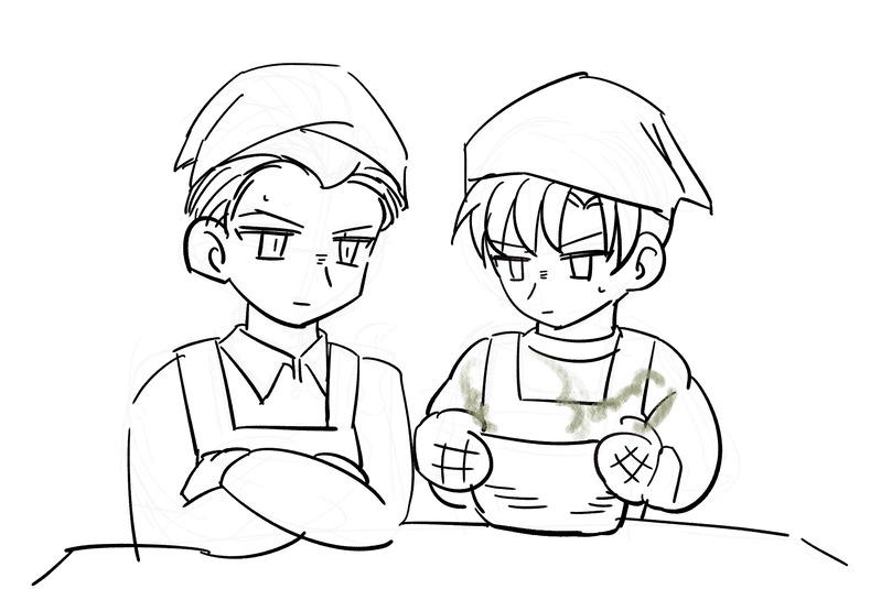 調理に難航してる二人と(1枚目)😺ミームを見ながらの落書きです(2枚目)