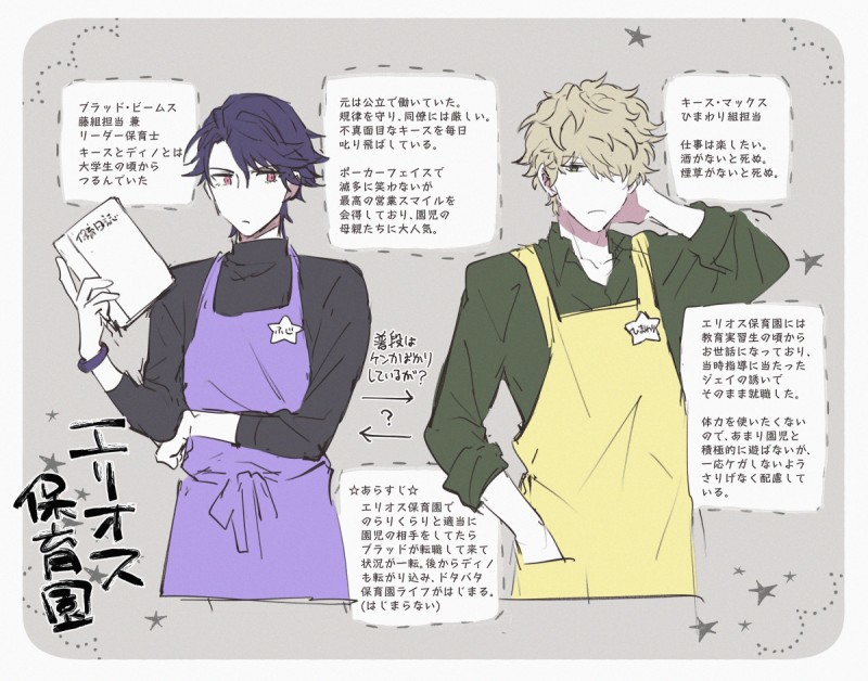 ブラッドさんはサクラ組にしようかと思ってたんだけど、最終的に色合わせにした。キースは…単純に緑の花が思いつかなかったのとヒマワリが…まあ合うんじゃないかって…思っ…。ジェイは担当クラスあったらタンポポry