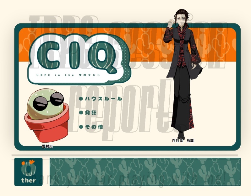 まるひ☆quiet followMEMOCoC『CIQ〜KPC in the サボテン〜』『ステュディオーロに座るのは』 2025年5月11日▶無彩色継続KPC / KP: 雪村 天 / 私PC / PL: 百目鬼 烏龍 / 麗さん show all(+1 images) Tap to full screen (size:1022x798).Repost is prohibited Let's send reactions! freqpopularsnackothersPayment processing Replies from the creator Follow creator you care about!☆quiet follow まるひMEMOCoC『東京四凶』 2025年9月25日END-A 全生還KP:小隅春さんHO1:ジロウ / 私HO2:烏鷺 / 麗さんHO3:高猿寺 蘭 / みかんさんHO4:シロヘビ / るんたさん 2 まるひMEMOCoC『DIGIN』 2025年9月20日▶何パン継続KPC / KP: ジャン=ジャック・ジャム / 私PC / PL: ニコラ・ハイモア / はしたさん まるひMEMOCoC『イドラの約束』 2025年9月14日エンド1 全生還KP:masuぼんさんHO1:白梅 胡椋 / みかんさんHO2:蒼依 穹 / ちゃぴさんHO3:月見里 結真 / 麗さんHO4:天下 理人 / るんたさんHO5:神庭 荒野 / 私 2 まるひSPOILERイドラの約束 現行・未通過×HO5秘匿シーンのらくがき 2 まるひMEMOCoC『OTHEllO - the Dee of Nara -』 2025年9月6日END:RKP:最永えるさんHO1:初瀬川 鉄平 / 私HO2:真白 満 / るんたさん 2 まるひMEMOCoC『ワンルーム・ディスコン 』 2025年8月31日エンド2KP:麗さんHO1:輿水 久遠 / 水月ハチさんHO2:春見 幽 / 私HO3:風炉 一番 / ゆのさんHO4:弥彦 雀 / みかんさん 2 recommended works zaigaotanyouDOODLE【炼炭】狸猫的出嫁(5) 32 FishDONE まるむDOODLE28 分身シチュ 黒デとデに分裂 19 matsuneoDOODLE 사장인데요DOODLE초백 @한계님 4 sako_ya_DOODLEげんみX 自陣○塔葬の国のらくがき~ 3 su2unyaREHABILI tak1maruOnDOODLE🐢🐧がイチャイチャしてるだけパス:鍵垢誕生日欄 B_E_L_L_X_DONEイメージシェーカーキーホルダー:ぴよぴよなかっぷはわかりません。(東雲あさな)※シナリオバレ無