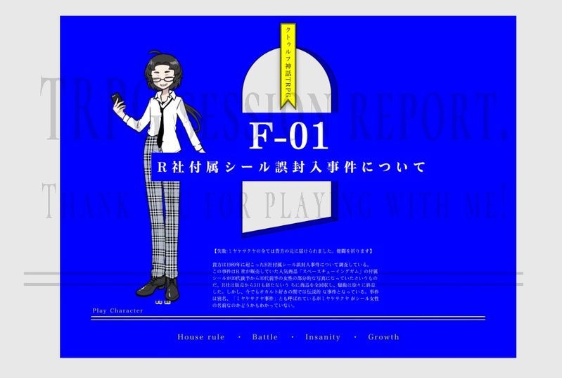 まるひ☆quiet followMEMOCoC『F-01.R社付属シール誤封入事件について』 2025年12月29日ロストKP:最永えるさんPC / PL: 草場 御影 / 私 Tap to full screen (size:946x636).Repost is prohibited Let's send reactions! freqpopularsnackothersPayment processing Replies from the creator Follow creator you care about!☆quiet follow まるひMEMOCoC『F-01.R社付属シール誤封入事件について』 2025年12月29日ロストKP:最永えるさんPC / PL: 草場 御影 / 私 まるひMEMOCoC『歌声にパレード』 2025年12月28日▶乱魔学園継続 KPレスPC / PL: 笹百合 蛍 / みかんさん 雛川 翼 / 私 翠嵐 侶烏 / 麗さん 夜見 龍月 / るんたさん まるひMEMOCoC『光、編みながら』 2025年12月25日▶無彩色継続 KPC / KP: 百目鬼 烏龍 / 麗さんPC / PL: 雪村 天 / 私 まるひMEMOCoC『冬鍋に兎』 2025年12月23日▶イドラの約束継続 KPレスPC / PL: 白梅 胡椋 / みかんさん 蒼依 穹 / ちゃぴさん 月見里 結真 / 麗さん 天下 理人 / るんたさん 神庭 荒野 / 私 まるひMEMOCoC『君の胴』 2025年12月15日▶いのけい継続 エンドAKPC / KP: 柴 撫子 / 私PC / PL: 斗南 北斗 / るんたさん まるひMEMOCoC『Once Upon A Time Fairytale』 2025年12月14日両生還 エンドA-3KP:麗さんHO化物:ウル / るんたさんHO人間:シンシア / 私 2 recommended works 發酵燒瓶DOODLE【权丕】没什么要预警的,只有博主的恶趣味需要注意! 3 3_tamariPROGRESSこういう……背景効果の変更を……している…… 2 e202312DONE急に描きたくなった🐁🧸💥🩷 jogy現パロ otomonenokoPAST🥀⚠️ sensitive content 2 Oops_jixuxoDOODLEI miss black whipPW: 18↑?(y/n) 2 ПанDONE 。。。MEMO 牛乳飲もDOODLE冬組すきー😭 ridiculedDOODLEなんかいろいろ落書きとかあいつだけ描いてなかった… 7