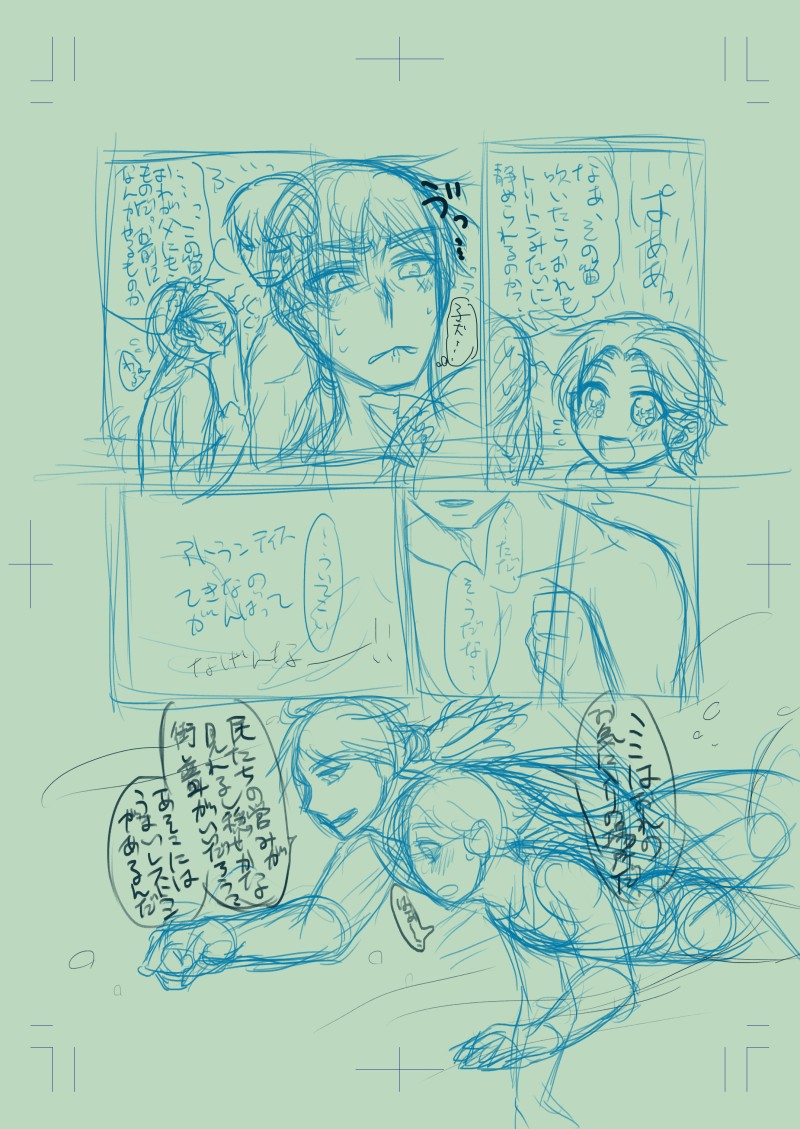目代圭子☆quiet followPROGRESS何とか今日中にネーム四ページ目まで終わったの嬉し~!本文あと12ページしか描けないのにその間にいちゃいちゃできんの?っていう不安しかないですがまあ頑張ってみまーす!誰に期待されてる訳でもないからね! #ネーム #トリパシ本 ##PJO Tap to full screen (size:2150x3035).Repost is prohibited Let's send reactions! freqpopularsnackothersPayment processing Replies from the creator Follow creator you care about!☆quiet follow 目代圭子DONEギーゼルの誕生日漫画の続き。久しぶりに百合親子せっせ描いたから楽しかったけど時間なさ過ぎてシアスちゃんの顔が微妙なところあるぅ…。 3 目代圭子PROGRESS2ページ目にゼウスおじい様の肩を書き足すこと。あとハロウィンじゃなくてスイートナイトにしよ。雪華のキャラデザ忘れた~~~だいぶ描いてないからね…。あとあと甘味がめっちゃ欲しいベルフェゴールがぼくのかんがえたさいきょうの電動車椅子みたいな電動車椅子で攻撃してくるも撃退するシアスちゃん、でも母上との契約でえちちなスライムのせいで試合終了になって母上がシアスちゃんとしけこむ展開描きたいなってメモ。 3 目代圭子PROGRESS鴉ひばれぷ本一頁目ネーム兼下書き 目代圭子PROGRESS過去にここまでしか描いてなかったアポパシ漫画ネームとりあえず上げておくね。気が向いたらちゃんと描きたいね。 3 目代圭子PROGRESS昨日の分のネーム達。結局一冊分のネーム全部載せてしまったの笑う。もし完成したら完成品と見比べるために買って見t(ry次で本文最後です。奥付入れなきゃだから話が終わる気がしない~~(震え声)後書きとかはコピ本の方にまとめて入れるYO……。 2 目代圭子PROGRESS今朝仕事に行く前に一枚ネーム終わらせた私を褒めてあげたい。これは今日中にネーム終わりますわ。(尚おまけは数えない事にする。)最近作業用BGMエロゲソングメドレーを試しに聞いてみたらめっちゃ好みな曲とかイラスト多くて聞いてるんだけどエロゲしたいなぁ……。性能のいいPCが欲しい……。親に見られそうになる所をすぐ隠せるように反応してくれる的な意味でちゃんとしたPC欲しい←絆きらめく恋いろは面白そう related works 目代圭子PROGRESS二ページめ。トリトンのキャラデザが固まらないまま書き始めるという恐ろしい奴よ……。なんだったら他の人の二次創作で書かれてたデザインのトリトン大好きだからそれでもよかった気はするけど公式が出してくれてたか記憶にないのでポニテだってことしか記憶にない。あと肌の色が緑。 目代圭子PROGRESSトリトンの衣装についての描写が本編にあまり無かったせいでネーム段階では全裸状態なのやめたい(震え声)うーん、苦手な構図描けるようになりたい~。あとなんかコマ割りする時三段にしがちなので頑張って二段とか使っていってみるンゴ。おっきく描くのもったいなくて……;;トライデント描くの苦手マン(定規と仲良くなれない)あっ、以前の分にリアクションくださった方ありがとうございます~!!元気出る~!! 目代圭子PROGRESS昨日ネーム一ページ描いて眠くなったから寝たので上げ忘れてた分。今日はまだ何も描いてないというかなんか現実逃避に書くキャラをイメージしたロゴ的なの描きたいなって言う謎のアレが(ry 目代圭子PROGRESS今日だけでネーム四枚進んだので自分神では????とりあえず本文、折り返し地点(ページ数的な意味での予定)まで着ましたがまだいちゃつく気配がないのでどうしよう本当にトリパシ本として出して大丈夫なのかと思ったけどまずトリパシ描いてる人日本で見てないから大丈夫だわ。四枚目はおまけページのネタをとりあえず忘れないように冒頭部分だけ描いた奴。2、三ページくらいのおまけの予定。 4 目代圭子PROGRESS何とか今日中にネーム四ページ目まで終わったの嬉し~!本文あと12ページしか描けないのにその間にいちゃいちゃできんの?っていう不安しかないですがまあ頑張ってみまーす!誰に期待されてる訳でもないからね! 目代圭子PROGRESS昨日の分のネーム達。結局一冊分のネーム全部載せてしまったの笑う。もし完成したら完成品と見比べるために買って見t(ry次で本文最後です。奥付入れなきゃだから話が終わる気がしない~~(震え声)後書きとかはコピ本の方にまとめて入れるYO……。 2 目代圭子PROGRESSネーム本文残り5ページとなりましたが果たして私があと5ページでトリパシ要素をもうちょっとぶち込めるのかが謎ですが頑張ってぶち込みたいね……。だいぶ二人の距離は近づいてきたとは思う。多分続きの本作ったらもっとトリパシいちゃいちゃ出来るかな……。 3 目代圭子PROGRESS今朝仕事に行く前に一枚ネーム終わらせた私を褒めてあげたい。これは今日中にネーム終わりますわ。(尚おまけは数えない事にする。)最近作業用BGMエロゲソングメドレーを試しに聞いてみたらめっちゃ好みな曲とかイラスト多くて聞いてるんだけどエロゲしたいなぁ……。性能のいいPCが欲しい……。親に見られそうになる所をすぐ隠せるように反応してくれる的な意味でちゃんとした