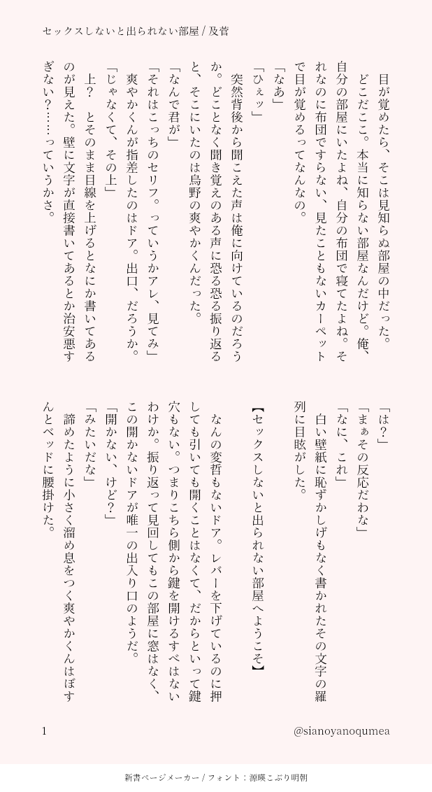 セックスしないと出られない部屋に閉じ込められたけどまだ付き合ってないどころか恋心すらない及菅のふたり。随時更新していきます。