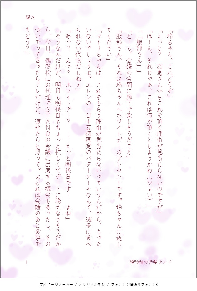 万喜(MAKI)☆quiet followDOODLE「お願い聞きます」の五つ目耀玲軸の赤髪サンド大谷羽鳥の初書きですので、こんなの羽鳥じゃないって思われるかもしれません。服部×羽鳥の秘密レコード参考にしています。ゆるい目でご覧ください。 show all(+3 images) Tap to full screen (size:630x928).Repost is prohibited Let's send reactions! freqpopularsnackothersPayment processing Replies from the creator Follow creator you care about!☆quiet follow 万喜(MAKI)DONE2024耀玲年賀SS 7 万喜(MAKI)DONEエアコレ・クリスマスSS「クリスマスドーナツ」【耀玲】 8 万喜(MAKI)MOURNINGあてんしょん!!!よく読んでからお入りください!チョコみんとちゃん(絵)と万喜(文)の悪ふざけです。なんでも許せる人だけご覧ください!おはなしじゃありません!大したものじゃないので期待はしないように!カッコいいハットリヨウはいません。二人とも服部が好きすぎた結果、行き過ぎたものが出来上がりました!そして、ついにゴールデンウィークです!情報を追加しての、期間限定公開です! 6 万喜(MAKI)PROGRESS 3803 万喜(MAKI)DONEネタバレしてますので、お気を付けください!メインスト第二部Report1File1読んで、佐々円と服部耀の関係性の妄想が捗り、書かずにはいられなかったので。 4 万喜(MAKI)DONEバレンタインカードエアコレ20230212【かたぱん】フラワーバレンタイン
