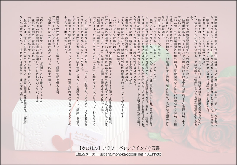 万喜(MAKI)☆quiet followDONEバレンタインカードエアコレ20230212【かたぱん】フラワーバレンタイン #かたぱん hardPlate #かたぱんサンド hard-bakedSandwich #服部耀 yoshihideHattori #渡部悟 satoruWatanabe #耀玲 yewLing #渡玲 goingToTaiwan Tap to full screen (size:1365x954).Repost is prohibited Let's send reactions! freqpopularsnackothersPayment processing Replies from the creator Follow creator you care about!☆quiet follow 万喜(MAKI)DONE2024耀玲年賀SS 7 万喜(MAKI)DONEエアコレ・クリスマスSS「クリスマスドーナツ」【耀玲】 8 万喜(MAKI)MOURNINGあてんしょん!!!よく読んでからお入りください!チョコみんとちゃん(絵)と万喜(文)の悪ふざけです。なんでも許せる人だけご覧ください!おはなしじゃありません!大したものじゃないので期待はしないように!カッコいいハットリヨウはいません。二人とも服部が好きすぎた結果、行き過ぎたものが出来上がりました!そして、ついにゴールデンウィークです!情報を追加しての、期間限定公開です! 6 万喜(MAKI)PROGRESS 3803 万喜(MAKI)DONEネタバレしてますので、お気を付けください!メインスト第二部Report1File1読んで、佐々円と服部耀の関係性の妄想が捗り、書かずにはいられなかったので。 4 万喜(MAKI)DONEバレンタインカードエアコレ20230212【かたぱん】フラワーバレンタイン related works 万喜(MAKI)DONEバレンタインカードエアコレ20230212【かたぱん】フラワーバレンタイン recommended works jun_horai0111swDONE年末年始SS渡玲ちゃんです。 4 jun_horai0111swDONE支部に上げた渡部さんBDの続きになるSS 4 hino_stmyDONEイベントに触発されたパロSSパイロット耀さんと新人CA玲ちゃんのお話 3 カヤコDONE【春の夜】春夏秋冬朝昼晩な耀玲ちゃん① 2 カヤコDONE かなかなMOURNING書きかけ放置SSを無理矢理完成させたもの。耀玲ちゃん。山もオチもない。その上時期外れ。まさかの冬のお話。途中地の文なくて会話だけになってるとこは、たぶん当時会話のリズムを壊したくなかったからだと思われる。 9 jun_horai0111swDONE耀玲です 4 jun_horai0111swDONETwitterのタグで書いた切り取り風SSマトリver. 9 YataDONE一服する36歳警視庁捜査一課長因みに銘柄はラッキーストライク🚬