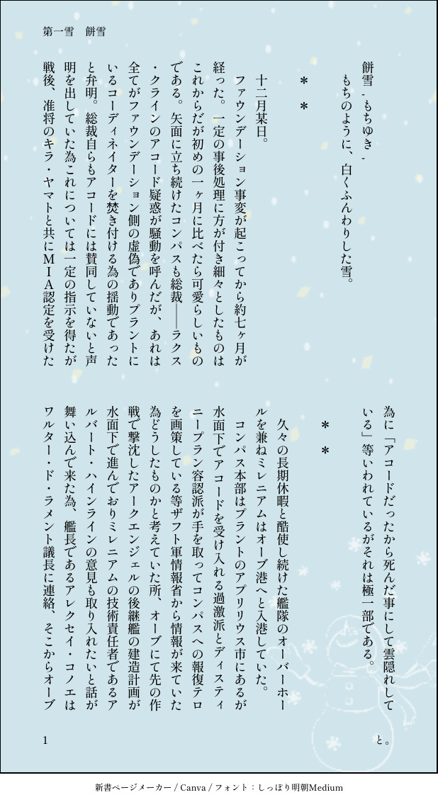 とまる☆quiet followDONE第一雪 餅雪原作軸二人は雪が降るロシアの地へと赴いていた。11月19日追記※マイ設定で艦長の父方の故郷はロシアっていう設定上で書いてます※ #千年の白雪 show all(+5 images) Tap to full screen (size:618x1132).Repost is prohibited Let's send reactions! freqpopularsnackothersPayment processing Replies from the creator Follow creator you care about!☆quiet follow とまるDONEオノ・ナ◯メさんのC◯PPERS1巻の愚痴をこ◯す場所のパロです。好きなんです、この話。🟧君がミ◯ルとパン屋を営みながら、そこにやってくるお客さんとの日常です。CPは🟥🟩でお送り致します。初回は🟥🟩だよ。気長に続きます。 5 とまるDONE某ソシャゲのイベントストーリーの一文に感化されて書きました。🟥🟩で騎士団パロです。赤薔薇と茨って言われたらそりゃね……。 5 とまるDONEのりと勢いで書いた🟥🟩の刑事パロ。はい、支部でも掲載してますが某刑事ドラマが好きなので🟥の役職はそっちからとってます。🟩は肉体労働派だなって思ってるんで、走ってもらいました。 3 とまるDONE歯医者に行くのが嫌すぎて現実逃避がてら書きました←n番煎じかの眠れない夜のシャリアのお話。シャアシャリだよ。作中のあれやこれやは作者の妄想捏造200%です。 4 とまるDONE #千年紀の担い手W・Dハイコノ版先手担当しました。 6 とまるDONEじーくあくす見てきました。緑のおじさんに脳みそ焼かれて来ました。二回目見に行きたいです。パンフ読む前の見た後のふんわりうろ覚えでの作者の第一印象で書いた緑のおじさんです。解釈違い等あったらごめんなさい!!※ネタバレ有り※ 2 related works とまるDONE第四雪 雪月夜ナチュラル艦長かくれんぼをする艦長と探す技大。 6 とまるDONE第二雪 衾雪5LDK(謎時空)雪が降った日の二人の日常です。 5 とまるDONE第一雪 餅雪原作軸二人は雪が降るロシアの地へと赴いていた。11月19日追記※マイ設定で艦長の父方の故郷はロシアっていう設定上で書いてます※ 6 とまるDONE第三雪 薄雪現代パロ風邪引きアルバートと看病アレクセイです。 5 とまるDONE第六雪目 暮雪FBパロただお手伝いにいく二人。 6 とまるDONEおまけ 垂ずり雪にゃんばーと帰ってこない飼い主と待ちぼうけな猫 3 recommended works indK9PAST亮懿补档③接上,坑了的本图 5 colacolaDOODLE🔞🔞🔞折枝(鳴潮 2 とまるDONE第一雪 餅雪原作軸二人は雪が降るロシアの地へと赴いていた。11月19日追記※マイ設定で艦長の父方の故郷はロシアっていう設定上で書いてます※ 6 とまるDONE第二雪 衾雪5LDK(謎時空)雪が降った日の二人の日常です。 5 いかそうめんDONEskebリクエストありがとうございました✨ブーストもありがとうございます(*'ω'*) 8 とまるDONE第三雪 薄雪現代パロ風邪引きアルバートと看病アレクセイです。 5 kosaDOODLE ばくまるDOODLEVOID げんみ❌NPCと自陣HO3のCP描写ご注意⚠足を盛大に挫いたとかそういう導入 4 http_wanningDOODLEJuliánContraseña: ¿eres mayor de edad? si o no