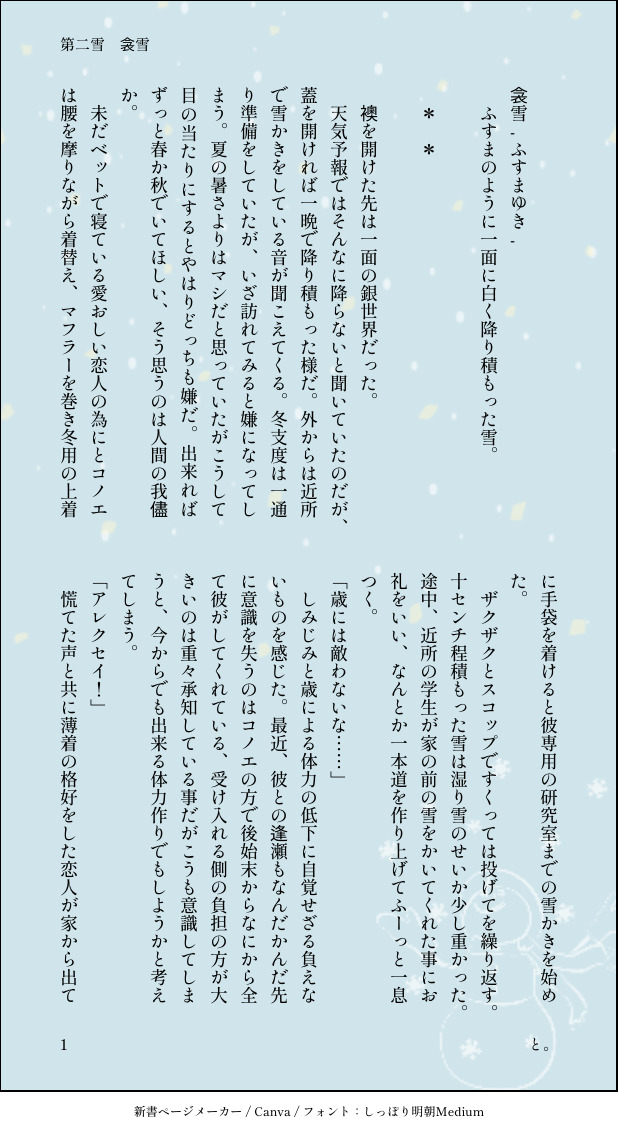 とまる☆quiet followDONE第二雪 衾雪5LDK(謎時空)雪が降った日の二人の日常です。 #千年の白雪 show all(+4 images) Tap to full screen (size:618x1132).Repost is prohibited Let's send reactions! freqpopularsnackothersPayment processing Replies from the creator Follow creator you care about!☆quiet follow とまるDONEオノ・ナ◯メさんのC◯PPERS1巻の愚痴をこ◯す場所のパロです。好きなんです、この話。🟧君がミ◯ルとパン屋を営みながら、そこにやってくるお客さんとの日常です。CPは🟥🟩でお送り致します。初回は🟥🟩だよ。気長に続きます。 5 とまるDONE某ソシャゲのイベントストーリーの一文に感化されて書きました。🟥🟩で騎士団パロです。赤薔薇と茨って言われたらそりゃね……。 5 とまるDONEのりと勢いで書いた🟥🟩の刑事パロ。はい、支部でも掲載してますが某刑事ドラマが好きなので🟥の役職はそっちからとってます。🟩は肉体労働派だなって思ってるんで、走ってもらいました。 3 とまるDONE歯医者に行くのが嫌すぎて現実逃避がてら書きました←n番煎じかの眠れない夜のシャリアのお話。シャアシャリだよ。作中のあれやこれやは作者の妄想捏造200%です。 4 とまるDONE #千年紀の担い手W・Dハイコノ版先手担当しました。 6 とまるDONEじーくあくす見てきました。緑のおじさんに脳みそ焼かれて来ました。二回目見に行きたいです。パンフ読む前の見た後のふんわりうろ覚えでの作者の第一印象で書いた緑のおじさんです。解釈違い等あったらごめんなさい!!※ネタバレ有り※ 2 related works とまるDONE第二雪 衾雪5LDK(謎時空)雪が降った日の二人の日常です。 5 とまるDONE第三雪 薄雪現代パロ風邪引きアルバートと看病アレクセイです。 5 とまるDONE第六雪目 暮雪FBパロただお手伝いにいく二人。 6 とまるDONEおまけ 垂ずり雪にゃんばーと帰ってこない飼い主と待ちぼうけな猫 3 とまるDONE第四雪 雪月夜ナチュラル艦長かくれんぼをする艦長と探す技大。 6 とまるDONE第一雪 餅雪原作軸二人は雪が降るロシアの地へと赴いていた。11月19日追記※マイ設定で艦長の父方の故郷はロシアっていう設定上で書いてます※ 6 recommended works nanoltyDOODLE【恒刃】换角期 3 とまるDONE第一雪 餅雪原作軸二人は雪が降るロシアの地へと赴いていた。11月19日追記※マイ設定で艦長の父方の故郷はロシアっていう設定上で書いてます※ 6 とまるDONE第二雪 衾雪5LDK(謎時空)雪が降った日の二人の日常です。 5 とまるDONE第三雪 薄雪現代パロ風邪引きアルバートと看病アレクセイです。 5 しぐれ卿DOODLE2024/12/09最近こねくり回してる920藤堂夢です とりあえずこんな設定で…なぜこの男で夢を始めてしまったのか私にもわかりません👹 2 mo!PAST君が笑うから🧜♂️ 森野クマ3PROGRESS今日の進歩450正面絵のキスされてる感じの内容好き FeeDOODLE miya_38510DOODLE念のため配慮