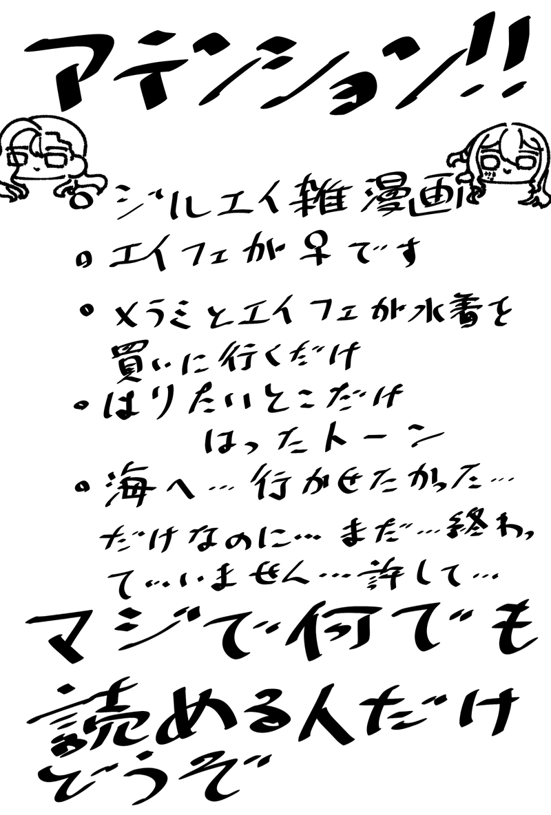 かすみ☆quiet followDONE夏キターと思って書いたネームを夏が終わる今描き終わりましたアテンションは必ず読んでね show all(+4 images) Tap to full screen (size:1181x1748).Repost is prohibited Let's send reactions! freqpopularsnackothersPayment processing Replies from the creator Follow creator you care about!☆quiet follow かすみDONE全ての人に、感謝と、申し訳なさを(ジルチ出てきません!!!モブ視点です!!!捏造しかないのでなんでも許せる方向け) 2216 かすみCAN’T MAKE出来たじゃないのはちょっと気に食わないからです!!もうどうにもならねぇ、許してくれ 喫煙者概念🏀がいるぜ(夜探じゃないけどカナイ区の他の場所に事務所作ってる捏造のジルエイ)(煙草吸ったことない人が書いてます) 2470 かすみDONE捏造しまくりいえ〜い!!!🏀の髪が切られる話。前半ほぼ👗さんと🏀。ED後、どこかの事務所にて、付き合ってないジルエイですのよ 2844 かすみDONE🦊の事務所の見習いモブ視点のジルエイです!!!モブいっぱい出てくるので苦手な方はご注意を。ED後のつもり!!!!!眠いので朝色々直すかも!!!!! 2629 かすみDONE楽しい!!難産!!!付き合ってる生存if!! 3272 かすみDONEまた雨とジルエイを書いています 楽しいネ 2331 recommended works れい🖋DONEいぬうさくん 8 tobinoDOODLEみどてと二個入りセットのうさぎとらっこせんせは忍くんが持ってる 君が瞼の裏にいる(攻め視点)MEMOパスワードは18↑かどうかを、yes/noで 923 まちばちゃMEMOレストン・オルスハウゼン⏱ 5 ひとさじここあDONE⚠️女体化と生理ネタがあります。なんでも許せる方向け かもオトスバ♀ 漫画っぽいの2p+後日談ぽいらくがき 3 mtr_trpg18DOODLE野狗子と薬師 現行未通過❌仕上げるに至らなかったただの自陣のらくがき放流です 🌸有也DOODLEいい兄さんの日と、いい双子の日〜本編の仲良し√を切望します… 2 たぴ🍻DOODLEソプスクげんみ❌おすすめ欄にかわいいの流れてきたので落書き 2 QQ_910_DOODLE317お誕生日!そして新曲ありがとう🎂