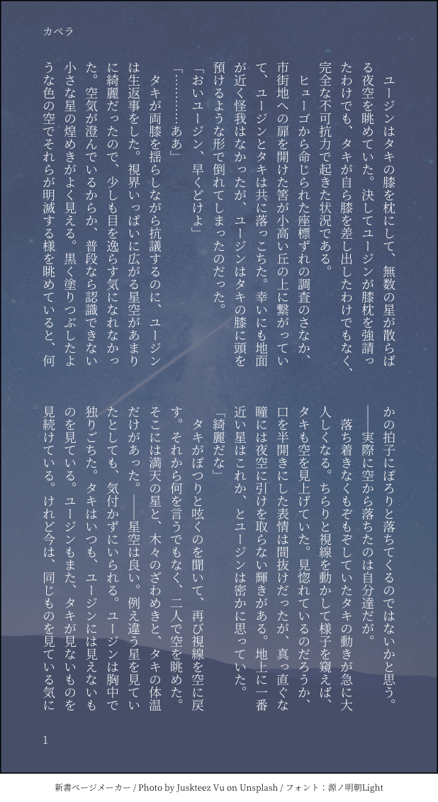 本能覚醒☆quiet followPASTカペラタキユジが星を見ているだけなぜ膝枕かというと、めちゃくちゃ好きな詩を元にしているから…… ##タキユジ show all(+1 images) Tap to full screen (size:618x1132).Repost is prohibited Let's send reactions! freqpopularsnackothersPayment processing Replies from the creator Follow creator you care about!☆quiet follow 本能覚醒PAST二になる不老不死になった二人が二人で生きていく話お互い以外の大切、特別があって、それから目を背けず誠実に生きる人を愛しているため、ハッピーエンドを書こうとするとこういうことになる 4 本能覚醒PAST花火を見るみげげとひゅうごいつか来るお別れにずっと、怯えている 4 本能覚醒PASTいかないでの話ミゲゲ誕、幼馴染ほんとは言いたいよ 本能覚醒PASTボロアパート引き払ってユジのオートロックに転がり込むタん息をするように現パロ 4 本能覚醒MOURNINGひゅうごえぜるばるとおぶべりるうっどという人間をあれほどまでに優しく美しくかたちづくったのはあんたや、ファーミントン…… 本能覚醒PAST騎士怪怪ユジとレナの初対面レナは本当に、なんか、やりたい放題で、俺は、マジでキミが好きだ…… recommended works みそ煮DOODLE頭巾なしver Ruri_LOMUTPASTCosplay写真このナゾの鍵は本棚の中!うーん…うーーん…!あ、先生!この本に辿り着いたということは私の宿題が出来たみたいだね。答えを聞かせてくれるかな?はい!先生の弟子ですから当然です! 4 豆シバPROGRESSやっぱ投げときたくなるよな!最後までやるか悩んでます 2 たまご豆腐DOODLE10月落書きまとめ。 22 nagi_k58INFO【2月14日応募締め切り】フォロワーさんに感謝を込めて抽選会の景品が出そろいました!応募は私のXホームにクリップしてあるツイートをRPで完了です✨応募締め切りは明日までとなりますー!よろしくお願いいたします。 19 xxx_osktDONE甚時(非常勤講師×補助監督IF) 936 omochi_hoshiDOODLE先生とクァイドゥールさんのらくがき四枚 4 kamijo_gDONE自身のクリスマスのアイコン用にトナカイ尾何考えてるの?どういう感情?という表情してる尾が好きです しん・アナログ練習TRAINING2024.12.14https://www.posemaniacs.com/tools/viewer/poses/01HGYNYV9QHSTT1QFJSCA4K85K 4