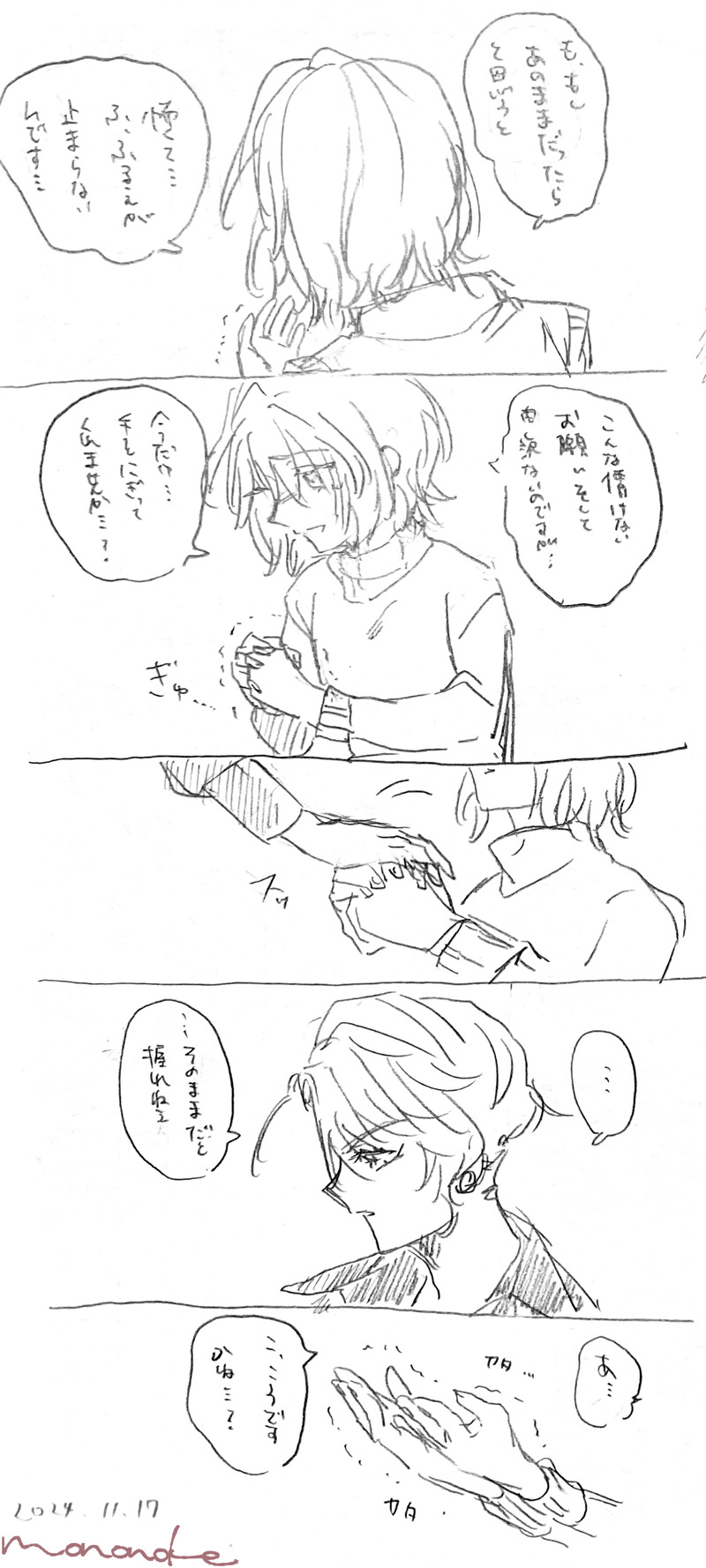 もののけ☆quiet followDOODLE皇エー♀(創作エージェントがいます)手を繋いで欲しかっただけの縦長アナログ漫画です。この後何かのタイミングでエーの荷物を持とうと手を伸ばしたら「え、もう手は繋がなくて大丈夫ですよ」って言われて、周囲に手を繋いだことがバレます。コイツってばついにPCに画像取り込んでセリフ入れることすら諦めましたよアニキ…… show all(+1 images) Tap to full screen (size:1047x2327).Repost is prohibited Let's send reactions! freqpopularsnackothersPayment processing Replies from the creator Follow creator you care about!☆quiet follow もののけDOODLE皇エー♀(創作エージェントの顔があります)アナログらくがき漫画です。お夜食のお話2本です。エーの食欲のメーターを全開にしすぎたかもしれない。 2 もののけSPOILER皇エー♀(創作エージェントの顔があります)(誕生日ボイスのネタバレ?があります)誕生日ボイスを聞いて生み出しました。みんなお祝いしてくれて、これからもライダーとエージェントみんな仲良くな…の気持ちになりました。ところでエーは一体いくつケーキを食べるのでしょうね… 2 もののけDOODLE皇エー♀(創作エージェントの顔があります)アナログでの下書きが3本あります。字が読めない!1つめがエーの偽物が現れたカオワの話で、2つめがエーが山で滑落して気絶した話(未完)、3つめが謎ビームで自分の衝動が抑えられなくなってしまったエーの話です。 8 もののけDOODLE注意:女体化かなり前(リリースしてすぐの頃)に皇さんを描こうとしてうっかり女体化してしまった絵です。供養 もののけDOODLE皇エー♀(創作エージェントの顔があります)ただジャンケンしてるだけの話の下書き(ほぼ文字だけ)です。ジャンケン鬼強そう。不意打ちジャンケンなら負けてくれるだろうか…。今年描いたものは今年のうちに流しておこう…の投稿です。未完が多いけど、たくさんお話考えられて楽しかった一年でした~! 3 もののけDOODLE皇エー♀(創作エージェントの顔があります)アナログ縦長漫画がひとつです。ナチュラルに猫語を理解する皇さんがいます。エーが猫になった原因は決めてません……何にしようか…… recommended works き なDOODLE楽しみだね④ yora_samaSPOILER軍師の感想追加😌(ネタバレしない程度に感情爆発させてるイラスト感想ですが偏りが酷いです。酷い偏りようです。) 6 もにこPAST🐞💔ジョルポル過去絵 (⚠肌色)18歳以上の方のみ閲覧OKですパスワード (y/n) 黄月ナイチMEMOロマサガ2RSでワグナスのあれこれに膝をやられてしまいしたためたスーワグ(第一形態×第一形態)の記録。触手描写があり女体化要素強め。pixivと同じ文です。 9512 @TASUKU_ariumDONE173絵チャ 闇鍋🔸お邪魔しました POI10936457DOODLE🪔𝖶𝖤𝖫𝖢𝖮𝖬𝖤 𝖳𝖮 DADA 365 BOOKwww.dada365.now #IPL2025 #dada365 #dada365news #virat #cricketindia #csk #klrahul #bigbashleague #testcricket #cricketers #hardikpandya #dream #cricketworldcup マジックぺんDOODLE軍師ネタバレ!!とりあえず落書き随時追加すると思います 7 hagi_99fDONEVOID自陣二次創作 ひとほしDOODLE脱衣麻雀でボロ負けしてほしいよな、ブロに。「全部脱いだから…っ、…もう……払えな…」「まだ南3局が残っているが?」(アタブロ)