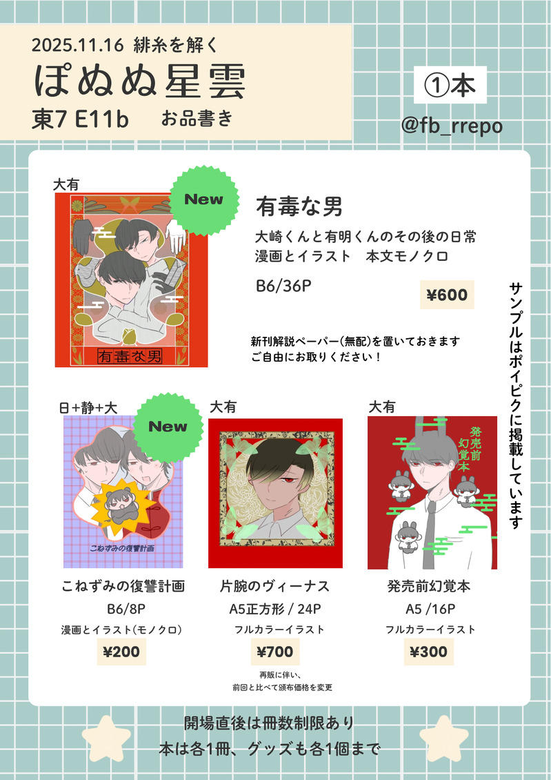 ぽぬみちゃむ☆quiet followMENU【11/16 COMIC CITY SPARK 20-day2- 緋糸を解く お品書き】ぽぬぬ星雲 / 東7 E11b 参加します!よろしくお願いします既刊の説明はポイピク内にあります通販はあまり期待しないでください😭 show all(+10 images) Tap to full screen (size:1415x2000).Repost is prohibited Let's send reactions! freqpopularsnackothersPayment processing Replies from the creator Follow creator you care about!☆quiet follow ぽぬみちゃむDOODLE大有23ハロウィン!律儀にお菓子を渡す大崎神父とサキュバスシスター(?)もいいと思う o有のハロウィンってなんかイメプ感すごい笑 4 ぽぬみちゃむINFO【取り置きのご案内】初の試みのため、ご不便をおかけするかもしれませんひとまず、サークル参加者(かつこのアカウントをフォロー)の方でお願いいたします!詳細は頒布物ごとにポイピクにまとめましたので、参考にしてください♪トリオキニでは大有新刊のみを登録していますその他何かあればトリオキニのコメント欄から送っていただければ、柔軟に対応します!※10月末で募集終了 2 ぽぬみちゃむMENU【11/16 COMIC CITY SPARK 20-day2- 緋糸を解く お品書き】ぽぬぬ星雲 / 東7 E11b 参加します!よろしくお願いします既刊の説明はポイピク内にあります通販はあまり期待しないでください😭 11 ぽぬみちゃむDONE【既刊】発売前幻覚本A5/16p/大有発売前に書いたイラストほとんど画像欄に載っているので表紙と謎絵を載せときます 2 ぽぬみちゃむDONE【既刊】片腕のヴィーナスA5正方形/24p/大有フルカラーイラスト本再販に伴い、頒布価格を変更しています 2 ぽぬみちゃむSPOILER湘南十景有明編感想大好き!多分この日は同僚に遠慮してあんまりご飯食べられなかったと思うので再度どこかの祭りで屋台飯爆食いデートしてほしい 2