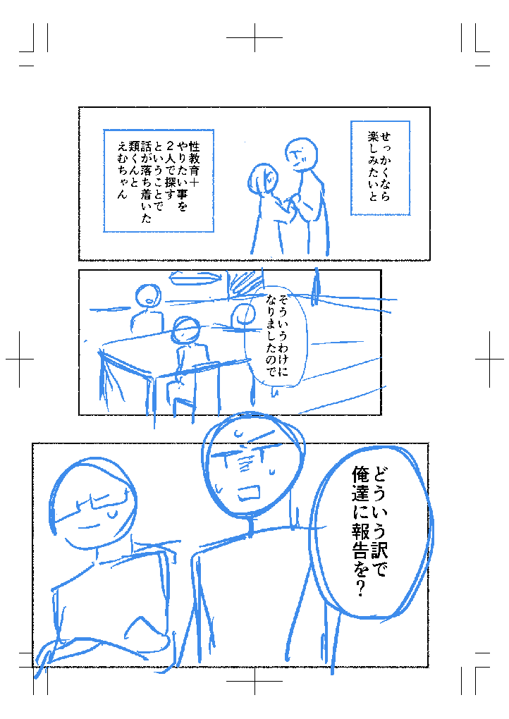 しゃめしゃん☆quiet followPROGRESS類えむセンシティブ話後日談。兄と類。 #ネーム進捗 nameProgress show all(+5 images) Tap to full screen (size:722x1020).Repost is prohibited Let's send reactions! freqpopularsnackothersPayment processing Replies from the creator Follow creator you care about!☆quiet follow しゃめしゃんTRAININGえむちゃんドール作るということで、未熟時代から練習の様子を載せます。 7 しゃめしゃんDOODLEこっちもエイプリルフールに即興で語ったお話。友人とボーイフレンドのお話なのでポイピクでだけ。友人になると一番のフィクション部分が「私はお菓子作りをしない」だそうです。 1420 しゃめしゃんDOODLE去年(令和6年)エイプリルフールに友人と通話中、即興で作った類えむとさめのお話。 1102 しゃめしゃんPROGRESS食べられてしまいそう…シチュエーションを逆(まんまの意味)でやる類えむちゃん。 4 しゃめしゃんPROGRESS類えむセンシティブ話後日談。兄と類。 6 しゃめしゃんPROGRESS類えむネーム。分かったわけじゃないんだよ 4 related works 有柚まさきPROGRESSあら、かわいい 新橋エナPROGRESS一次創作漫画「灯火のグロウフライ」のネーム進捗まとめ。Twitterにあげていないものもあります。現在ネームは40頁目。前編の半分はいったかな? 5 ノヴだのノッヴだのヴォムだのPROGRESS3話構成の2話め。3話目の作画に入ったくらいで1話目とともにどっかにあげる予定 16 ノヴだのノッヴだのヴォムだのMOURNING(3/3)54ページも描いちゃった やっぱ枚数描くと絵がすんごい変わるなー… 16 新橋エナPROGRESSともフラ前編ネーム、62頁より。回想シーンです。左下のコマにたくさんキャラがいます。彼らはヒーローとヒロインの同期でした。一緒に研修を受けた仲。ただ、上三人は本編前に亡くなっており、下二人はヒーローを辞めています。要するにみんな本編には出てきません(歳之だけは回想などで出てきます)。描いていてなかなか悲しいです…この悲しみが読者の皆様にも伝わるよう、制作頑張ります。 ノヴだのノッヴだのヴォムだのMOURNING(2/3)54ページも描いちゃった エドジェはたぶん単発のつもり 21 能勢ナツキPROGRESS絲遣い6巻ネーム出来ましたっ……!!今回は50pです。できればあと2〜5p削りたかったけどエピソード量的にさすがに無理でした💦本当は余裕持たせるならむしろ+5pくらいあった方が良さそうですが、ページ多くなると作画作業に時間かかり過ぎてしまうので何としてでも50p以内には収めたかった結果のギリギリ50pです笑 能勢ナツキPROGRESS新作読切のネームが描けましたーー!!!👏👏👏2022年に予告編だけ出しっぱなし放置だった『彼岸の守人』です。https://www.pixiv.net/artworks/99522353作画は絲遣い6巻作業終わってからぼちぼち考えます。でも60pになってしまったので…描くのが…めんどくさい…………笑 ノヴだのノッヴだのヴォムだのPROGRESS3話構成の3話目。最後の2ページがこれまでのギミック完全無視で本っ当に気に食わないので作画のとき絶対描きなおす 16 recommended works heshikiri_cuteDOODLE類えむスマイルオブドリーマー以降類くんにはえむちゃんに庇護欲みたいなのが芽生えてると思うんですよ… 4 はばくれDOODLE正しいことを言っただけなのに類の地雷を踏んでしまいいきなりぶつけられたクソデカ感情を処理できず泣くことしか出来ない鳳えむ 3 はばくれDONE本当のあたしじゃないとかどうだっていい 2 heshikiri_cuteDOODLE※プロセカメインストーリーの内容を含みます。僕が考えた最強のみずえむ(←類)公式で絡む前のガッツリ捏造なんでポイピクのみにこっそり。文字めちゃ読みにくいです、ごめんなさい。 yummyMOURNING 3 新橋エナPROGRESSともフラ前編ネーム、62頁より。回想シーンです。左下のコマにたくさんキャラがいます。彼らはヒーローとヒロインの同期でした。一緒に研修を受けた仲。ただ、上三人は本編前に亡くなっており、下二人はヒーローを辞めています。要するにみんな本編には出てきません(歳之だけは回想などで出てきます)。描いていてなかなか悲しいです…この悲しみが読者の皆様にも伝わるよう、制作頑張ります。 takeyamaryuDONE #AlvaLuca #隠囚 ⚡⛓ #AlvaLorenz #LucaBalsa #LucasBalzac もずこんぶDONE5月イベントで頒布予定の類えむ漫画です!※鉛筆漫画(準備号)※付き合ってる 6 mary1201kmgnDOODLE