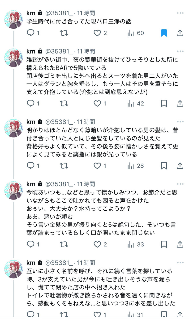 km_35☆quiet followMEMO学生時代に付き合ってた三浄が一回別れて数年後再会してまた付き合う話です(現パロ) ##三浄 show all(+4 images) Tap to full screen (size:1179x1987).Repost is prohibited Let's send reactions! freqpopularsnackothersPayment processing Replies from the creator Follow creator you care about!☆quiet follow km_35DOODLE褒めてもらったのでお礼にょ5ちゃ❤️ km_35DOODLE秋にょ5 km_35DOODLEこないだ読んだふぉろわさんの三次創作です km_35DONE証明写真風一行 🌗 2 km_35DOODLEついったに載せてた5 2 km_35DOODLEついったに載せてた9にょ5 2 recommended works サブリミナル美MEMO犬っぽい笑顔の子の練習、とだけ決めて描き始める。顔体髪はある程度想像していたものを描き、それから笑顔の理由や性格なんかを妄想して、加筆修正。タトゥーと首輪類で理由付け完了。私に勇気と技術があればこいつで18禁漫画描きたいくらいには気に入ってる。即興でキャラ作るのって楽しいし、しっかり考えて作るより気に入る確率高いの不思議。 銀夏@richie_wassonPROGRESSオリジナル創作漫画、続き。表情をいい感じに描けたかな、と思います。画力ないなりに(苦笑)花咲み、馨る君へ。#5#オリジナル創作BL#創作BL#BL 17 zo_tuiteDOODLEたのしい危機契約#5 エリジウムマジイケ鳥! ましろ🍠DOODLE #5 劇場版OSが好きです。 しばた三歳DONE【含光君の恋文】#5cql第56話「口付けの真意」(強めの妄想)【注意とごあいさつ】・小さいモブがおります・ようやく進展。そのうちR-18に突入いたします・アニメ/原作/cql履修済・設定捏造してます、ふわっとお読みください 16301 e弈eDOODLE #5『抱き地蔵』 mmmmm1220DONE数年後カリジャミ。カリジャミと言いつつ、カリジャミになるまでのお話です。以前発行したカリジャミ本は「ジャミルがぐいぐいいく」お話だったので、今回は「カリムがぐいぐいいく」お話にしました。----【カリジャミWebオンリー】輝く世界に自由の花と #5開催おめでとうございます! 24 NelDONEカリジャミWebオンリー【輝く世界に自由の花と#5】開催おめでとうございます💐ハロウィンガーランド風のイラストです!⚠️パスワードはお品書きにあります!印刷用に2種あります。🏪ネットプリント①(セブン):59616615 ⚠️11/4(土) 23:59頃まで🏪ネットプリント②(ローソン・ファミマ):J329DYW6B6⚠️11/7(火) 20:00頃までプリントはL版 2 tench_twstDOODLE■ニノハナ#5 展示■前にXに投稿したキスしてるカリジャミの続き。ちょっと古いです 2