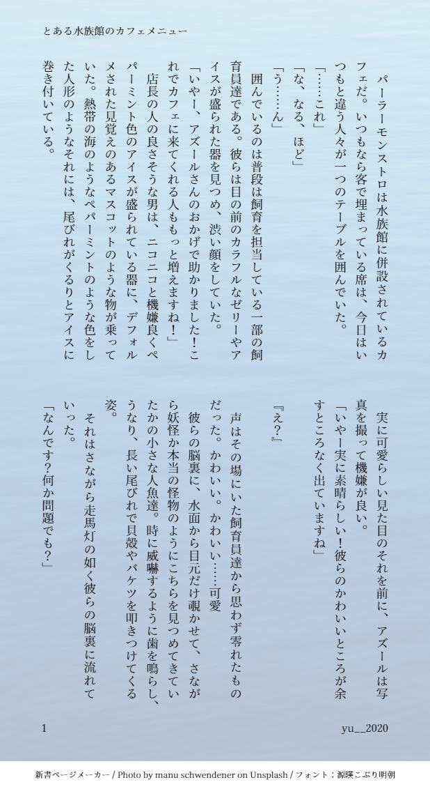 yu__2020☆quiet followDOODLE朝活流しキュイ。今日はドアスイ。カフェメニュー試食をする飼育員さん達。 #朝活ydaz show all(+1 images) Tap to full screen (size:618x1132).Repost is prohibited Let's send reactions! freqpopularsnackothersPayment processing Replies from the creator Follow creator you care about!☆quiet follow yu__2020DOODLEハッピーけだまWeekend訳ありけだまのイドアズ。儚き鳥(?)ともふもふ狼のほのぼのかもしれない何かの始まり。続きはない。 1978 yu__2020DOODLEヤンパリ風のゲーム生物のイドとゲームを遊ぶショタアズのイドアズ。ゲームプレイ編2 ピクニックで他の人と遊ぶのを嫌がるヤンパリ達(かわいいの姿)をイメージ。 2320 yu__2020DOODLE朝活流しキュイ。今日はドアスイ。カフェメニュー試食をする飼育員さん達。 2 yu__2020DOODLE流しけだま。アズがオコジョの姿。基本に忠実な元気なオコジョのアズとキャッキャするイドのイドアズ風味。 2 yu__2020MOURNINGニューイヤーイベントおめでとうって事で去年書いたお正月のお話。紙に出すかまとめるかするのを忘れてそのままにしていたからもう一回晒す。東洋のとある国が開国して少しくらいにやってきた外国の異人達のお話。イドアズ 5172 yu__2020DOODLEコンス*ンティン風イドアズ。特に深く考えていないしカトリック分からないからふわっとしてる。悪魔のジェと天使のフロと色々あって契約して現世至上主義、天も冥界しらねー!と悪魔をバットとかでハレルヤファ*キンとか言って祓う祓い師のお話。 8007 related works yu__2020DOODLE朝活流しキュイ。今日はドアスイ。カフェメニュー試食をする飼育員さん達。 2 recommended works おぎんさんDOODLE気が済んだ?原稿しようね♡ みずきゆうこPROGRESSハロウィン🎃ジェイアズ。色の塗り方はノープランorz 2 n.カルーアDOODLE #ジェイアズワンウィークドロライ第52回「月」シロツメクサの真ん中で寝転ぶジェがきれいでかわいくて少し見惚れたことは内緒。アズと仲良くジェをかわいがるフロがいます。「シロツメクサの海」 7 sponge_myvDOODLEジェイドにしっぽが生える話(ジェイアズ)イド蛸アニバーサリー開催ありがとうございます!甘え下手だけど体は正直なジェイドです。 3 @shin_sugarmaroDONE記憶喪失ジェイド6 おまけ薬を飲んだ翌朝 roar_anjelina_DONE現代転生パロディ。フロ視点のジェ→アズ。恋愛描写はジェ→アズのみですが、内容はオクタサンコイチメインです。※20代の大学生設定(お酒はハタチになってから!) 8 aokumayaDOODLE同僚水前提※にょた有💧🌳くんとにょ💧🌳ちゃんに、TLで見たやつを着せた💧🌳くんの場合:「くそっこれ女物じゃねえか…何がしたいんだよ変態っ」と不貞腐れてるし、ハイレグ気味だから🍄がはみ出ないか気が気でないにょ💧🌳ちゃんの場合:「なんだお前さっきから乳ばっか見て、DTには刺激が強すぎたかぁ~?」(同僚くんをDTだと思ってて初めての🎄に発破かけたつもり、この後分からせられる) 可惜夜DONEメリークリスマスです!!🎄.*ES2年目軸のKnightsのお話。日頃の感謝をこめて司が4人の仲間たちにサプライズ作戦を決行しようとしているみたい…? 7005 icechabeanDOODLE墓守 + 騎士 - FightCommision to Suzuka's Grave/on fb