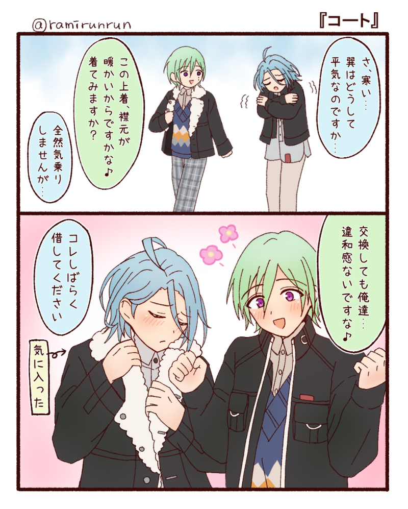 ramirunrun☆quiet followDONE巽ひめワンドロ用に♪テーマはコートでした!2人の上着はコートって言うのかな?ジャケットかな?というあやふやな部分はありますが!元々2人の上着似てるな~と思っていたので、交換させてみたいと思っていました😄 #あんさん腐るスターズ!! ansanRottenStars! #巽ひめ smallDriedSatsumi Tap to full screen (size:802x1000).Repost is prohibited Let's send reactions! freqpopularsnackothersPayment processing Replies from the creator Follow creator you care about!☆quiet follow ramirunrunDONE巽ひめワンドロ用に♪テーマはコートでした!2人の上着はコートって言うのかな?ジャケットかな?というあやふやな部分はありますが!元々2人の上着似てるな~と思っていたので、交換させてみたいと思っていました😄 ramirunrunDONE2025年クリスマスキャンペーンのHiMERUさんと鬼龍紅郎さんのコンビ♪鬼龍さん優しすぎ…萌えた☺️ ramirunrunDONE初めてトーンを使ってみた作品♪エリオスコラボで燐音くんは攻撃されると痛そうな声を出すので心配なりました!メルメルは余裕そうでしたね。エリオスタワーが見えるホテルに泊めてもらった事にしました♪あと2ページくらいの続きを制作中です! ramirunrunDONEXで燐ひめの小説をよく書いている、みれあさんのショートストーリーに挿絵を描いてみました♪私にしては大人っぽく描けたかな~♪お話を考えるのが1番大変だから、絵だけ付けるのは楽しかったです♪もうちょっと上手くなりたいけどな~💦 4 ramirunrunDONE巽ひめワンドロ用に♪テーマは『寒風』旬のネタを入れたくてこんな話になりましたなんか巽さんごめん(笑)この後HiMERUさんが、体の芯までヒエヒエになった巽さんの手でも握って温めてくれるはず… ramirunrunDONEHiMERU王を観戦する十条要くんのギャグを描きました♪要くんが恋しくなったぜ~何も考えずに勢いで描いたマンガだったけど、Xで沢山いいねが貰えた作品!びっくりした! related works maymfdear5DONE渉友♀︎です。懲りずに女体化ですし、またも生理ネタ。生殺しされる渉。 2513 ぱいちゃんDeep Desireモブ燐 ごめん ramirunrunDONEモテ男クロススカウトのストから~♪薫くんと零さんが誰に投票したのかは明かされなかったので…勝手に描いた😆♡ 2 ぱいちゃんDONEニキ燐. me_ba_eDOODLE乳首を開発したい練習 2 ramirunrunDONEXで燐ひめの小説をよく書いている、みれあさんのショートストーリーに挿絵を描いてみました♪私にしては大人っぽく描けたかな~♪お話を考えるのが1番大変だから、絵だけ付けるのは楽しかったです♪もうちょっと上手くなりたいけどな~💦 4 あさぎPROGRESS燐ニキえっちしてる tarohi_pinkDONE描きたいとこだけ描いたヘンゼル成長ifヘンディシです…!⚠️ほんとにかきたいとこだけ欲望のままなので雑 ぱいちゃんDeep Desireえちチャイナ recommended works き むDONE #あんスタ初描き泉2018.8.24 sio_okuraPAST 3 runipplePAST さたPASTツイッタにあげてた全員分描けなかったBDの 11 にょこりDONE Kg🐤DONE⭐️4紅郎さん☺️昨日祈願にラフを描いたのですが、無事引けました!!!!*実は10日目です!引き続きがんばってみます...! すすすDONE誓いのキス/くちびるはまだだめ Sakura🌸DOODLEBe The Party Bee!🐝⋆︎*゚∗🐝ポイピクでらくがき😄 ひなここDONEインスタ風に流星隊🌟オフショ的な写真が大好き 2