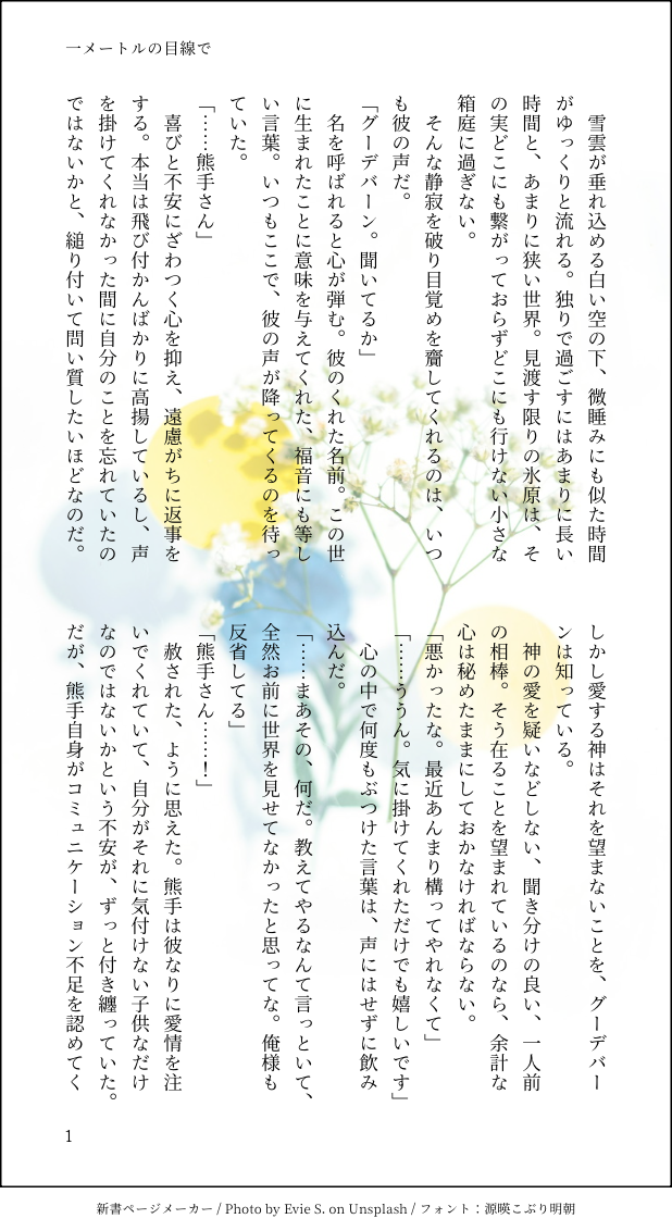 ハロウィンナイトメアの大葉焼き☆quiet followDONEグーデバーンがちびっ子サイズで人間界に顕現しちゃうお話。書き上がるまで時間がかかってしまいましたが11月頃の話と想定しています。登場する花はカラミンサ・ネペタ。実際に東京近郊で栽培してる所があるのかどうかは不明ですが、この世界線にはあるんだよってことで… show all(+15 images) Tap to full screen (size:618x1132).Repost is prohibited Let's send reactions! freqpopularsnackothersPayment processing Replies from the creator Follow creator you care about!☆quiet follow ハロウィンナイトメアの大葉焼きDONE #終日終夜のエピソード 企画にて書かせて頂いたものです。時間帯は「夕方」。小学生の召子さんと坊ちゃまのお話。 7 ハロウィンナイトメアの大葉焼きDONEグーデバーンがちびっ子サイズで人間界に顕現しちゃうお話。書き上がるまで時間がかかってしまいましたが11月頃の話と想定しています。登場する花はカラミンサ・ネペタ。実際に東京近郊で栽培してる所があるのかどうかは不明ですが、この世界線にはあるんだよってことで… 16 ハロウィンナイトメアの大葉焼きDONEブーケ嬢inテガ里withすみぽよ。この2人でお姉ちゃんナンバーワンバトルをするのかな、と思っていた時期もありました…。 6 ハロウィンナイトメアの大葉焼きDONE⚠️未公開⚠️ 16 ハロウィンナイトメアの大葉焼きDONE⚠️未公開⚠️ 15 ハロウィンナイトメアの大葉焼きDONE⚠️未公開⚠️ 12