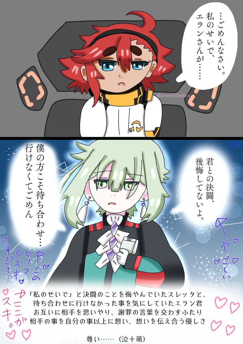 お互いに相手を思いやり、自分を責めて謝罪の言葉を交わすエラン君とスレッタ