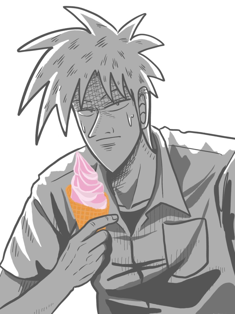 自分の計画では、もっと暗〜い感じで、光が殆ど無い、内面的にも闇を感じるような絵にしたかったんですが。それでこそ、このソフトクリームが強調されてさ?歪な雰囲気出したかったのにさ?気づいたらこうですよ。ただただ炎天下でソフトクリーム食おうとしてるハッピーな絵になっちまったんですよ。がっかりだぜ!もう一枚はヤケクソでダブルハッピーですよ…!!