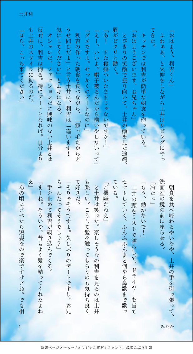 mitakaMNCkd☆quiet followDONE土井利現パロ朝の一コマ #忍たま #忍たま-腐 oshidama-Rotten #忍たま腐 ninjaSpiritRottenEggs #山田利吉 toshiyoshiYamada #土井半助 hansukeDoi #土井利 toshiDoi #土利 #利吉 liji #半助 semi-assist show all(+1 images) Tap to full screen (size:618x1132).Repost is prohibited Let's send reactions! freqpopularsnackothersPayment processing Replies from the creator Follow creator you care about!☆quiet follow mitakaMNCkdDONE雑利まとめ 6 mitakaMNCkdDONE雑高まとめ 3 mitakaMNCkdDONEツドイ設定的な利土井の利吉 mitakaMNCkdDONE土井利現パロ朝の一コマ 2 mitakaMNCkdDOODLE忍たま鉛筆描き✏️伝蔵(人形?)雑渡ギニョール綾部しん子(しんべヱ) 4 mitakaMNCkdDONE雑高雑渡は、伊作、利吉と軽く関係持ってる伊作、利吉もその辺は分かってるし高坂に至っては相手にしてないって設定で書いたもの 3 related works ポッポ丸PASTわんころ利吉 ポッポ丸TRAINING半子さん mitakaMNCkdDONE土井利現パロ朝の一コマ 2 recommended works 竹ノ谷ゆきみつPAST #忍たま#久々知兵助 空井香DOODLE初めまして。シャーペン落書きとか気軽に載せれたらいいなと開設してみました。1度ツイッターには上げたものですが…羽丹羽くんアニメでも早く会いたい🙌 ありすPAST 5 はまちTRAININGこれはオンラインの忍たまイベントに参加させていただいたときに描いたものです笑笑もうほんとに楽しかったです!!!また開催してほしい・・・・・ はまちTRAININGワンドロ用に描いたタカ丸さんです~GIFにしたので三枚あります~甘酒で温まってる(⌒∇⌒) 3 はまちTRAINING2020年描き納めはやっぱり五年生!!!!大変お世話になりました。 鈴おやつ。DONE 鈴おやつ。DONE もな香DOODLE忍たま 竹谷