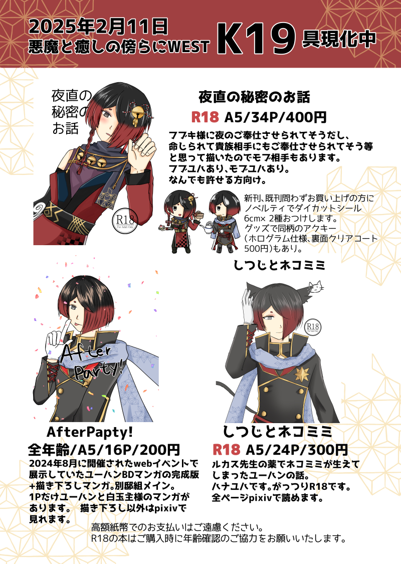 2025年2月11日(火祝)悪魔と癒しの傍らにWESTお品書き。 5年ぶりぐらいのリアル即売会参加になります。 よろしくお願いします。イベント終わってだいぶたってから、お品書きの別邸本のスペルミスに気づきました😂