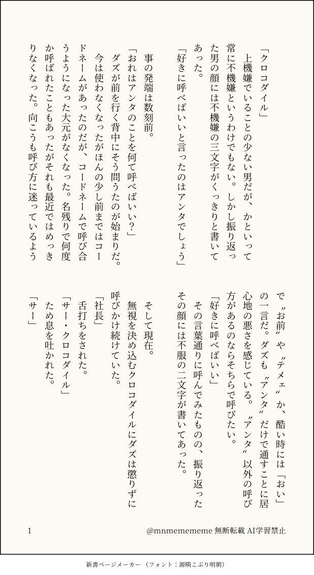 mnmemememe☆quiet followDONE鰐さんのこと呼び捨てするダズさんと、ダズさんのサー呼びに元副社長思い出して怒る鰐さんが書きたかっただけの話。 show all(+1 images) Tap to full screen (size:618x1132).Repost is prohibited Let's send reactions! freqpopularsnackothersPayment processing Replies from the creator Follow creator you care about!☆quiet follow mnmemememeDONE鰐誕書こうとしたらひねた話になった。本文に入れ忘れたけどこれがscene 1です。 4 mnmemememeDONEダズさんの口にさっきまで吸ってた葉巻押し込む鰐さんと、鰐さんの葉巻吸っておそろしく咽せるダズさんが見たいっていう思いつきから始まったダズ鰐。Xに上げてたものの修正版。 4 mnmemememeDONE鰐さんのこと呼び捨てするダズさんと、ダズさんのサー呼びに元副社長思い出して怒る鰐さんが書きたかっただけの話。 2 mnmemememeDONE覇気修行中のダズさんと鰐さん 3 mnmemememePROGRESS殺し屋時代のダズさん妄想モブ視点。ダズさんはいない 3 recommended works yuberaTRAINING逆バニーつかさくんとガーディアン(+差分2枚) 3 RinoTRAININGシアさん。シアがちゅき POI10928631DOODLEルイスの落書きまとめ(蹂躙現行未通過❌)パスワード▶蹂躙のネタバレあるので大丈夫な方だけ「yes」入力 6 yu-maDOODLE匋依 絶対に抱いてほしいバ織(17)VS絶対に抱かないバーテン(28)の謎シチュらくがき CVYqbtWiaMCuvKCDOODLEつべ時空🍁🐳小説です!文庫メーカー仕様変更してたので試運転でポイピク投稿しました 2501 SwitchMEMO限界⑱ 10月〜12月 22 hemimaru_zattaDOODLE12/18 今日もミニキャラ Yone_Yoneda_DONE※女装 ダイナー衣装こび chloris0906DOODLEcoc6「謎肉食べ食べ委員会」作 トドノツマリ海峡様PL/PC津傘様/巴 笙KP/KPC黎利水ちくわ/籠目 簓両生還にて閉幕🍖🍔🍗🥓_____________________はるへる継続謎肉!!!!!おもれ〜〜〜な〜〜〜マネちゃん達へごめんなさいでした