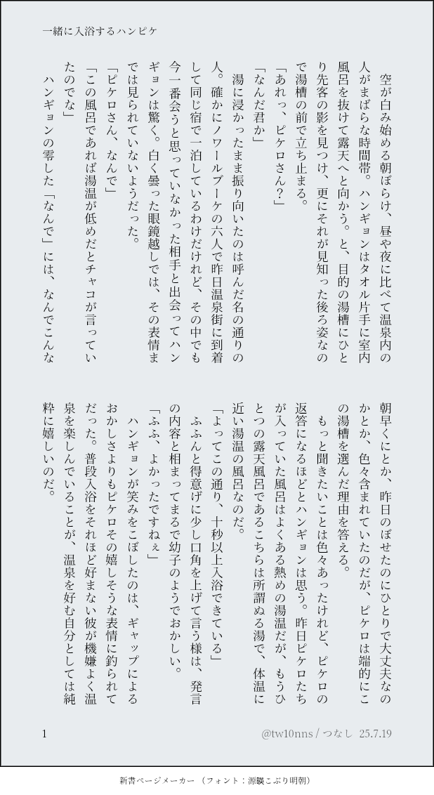 つなし☆quiet followDOODLE🐙🐸。風呂ガリありがと~~♨️♨️温泉街4コマの翌日のような。ハンピケで一緒に温泉に入って欲しかった #ハンピケ show all(+3 images) Tap to full screen (size:618x1132).Repost is prohibited Let's send reactions! freqpopularsnackothersPayment processing Replies from the creator Follow creator you care about!☆quiet follow つなしMENU【10月19日 なかよくナイトミュージアム SP2025】で発行予定のハンピケ小説本『メロウバカンス』のR18部分サンプルです。18歳以上なら「yes」で開きます。健全部分はTwitterに。(Pixivでは画像ではなく、文章で同様のサンプル有)サンプルなので、実際の本の段組と若干異なります。(当日は年齢確認のできる身分証をお持ちください)他、詳細はTwitterでご確認お願いします。 6 つなしDOODLE🐙🐸SS名刺サイズでスケベを書こうチャレンジ。ふわふわになってるピケさんはかわいいね。実際最中はもっともっと頭の中ぐちゃぐちゃだと思いますセルフお題は「ピストン」でした♡そんなにえっちじゃないけど、一応情事描写なので18歳以上ならyesで つなしDONE【朗報】突然の学パロ!CPがめちゃめちゃなのでなんでも許せる方向け!🐊→🐸が始まりそうな雰囲気で、🐙→🐊←🐙と🐙→🐸が土台にある。一番直接的なCP絡みがあるのは🐙🐸。細かい設定は決めてないので、IQ2のラブコメだと思って、フィーリングでお読みください。らくがきのつもりだった…(一応末尾に、この話における個人的CP思考を載せています。お好みで読んでください) 9 つなしDOODLE🐙🐸。風呂ガリありがと~~♨️♨️温泉街4コマの翌日のような。ハンピケで一緒に温泉に入って欲しかった 4 つなしDONE🐙🐸。真夜中にピケロのところにやって来るハンギョンの話。これから始まる感じのハンピケです。25.6.26にあらゆる情報の過剰摂取で気を失った後に書いたもの。Ep4もウォチパもありがとう…(25.7.25 ページ順間違えていたのを直しました) 4 つなしDONE🐙🐸。ノワブep4(🐙王国)公開前の、無いEp4の匂わせるハンピケの話。チャコ視点なのでCP要素は薄め。Pixivに上げているものと同じ話の画像版です。昨夜はふたりで何してたんでしょうね〜 7 related works つなしDONE【朗報】突然の学パロ!CPがめちゃめちゃなのでなんでも許せる方向け!🐊→🐸が始まりそうな雰囲気で、🐙→🐊←🐙と🐙→🐸が土台にある。一番直接的なCP絡みがあるのは🐙🐸。細かい設定は決めてないので、IQ2のラブコメだと思って、フィーリングでお読みください。らくがきのつもりだった…(一応末尾に、この話における個人的CP思考を載せています。お好みで読んでください) 9 つなしDOODLE🐙🐸。風呂ガリありがと~~♨️♨️温泉街4コマの翌日のような。ハンピケで一緒に温泉に入って欲しかった 4 つなしDOODLE🐙🐸。キスの日にちなんだハンピケらくがき つなしDONE🐙🐸中編予告で🐙の画像が来てカッとなって書いた捏造ep3後のハンピケです。(※前編しか公開されてない時点で執筆しています)◆捏造ポイント◆◇けろぴ様がシーズに取り憑かれた的な理由でモニタリングしていた◇上記を解決するために、ピケがハンに助けを求めていて、ハンが合流した◇諸々無事に解決して、今度は皆でハンの王国に行こうね〜的な感じの前夜想定 4 つなしMEMO🐙🐸妄想メモ。自分の知らん間にからだ開発されてるのってエッロいですよね……というハンピケ🐙🐸です(※少々倫理観がない、かも?)18歳以上ならyesで 1109 つなしDONE🐙🐸いつも言ってる感じのセフレのハンピケです。何も始まってないけど、情事の話は普通にしているのでOKな人はどうぞ♡ 3 つなしMENU【10月19日 なかよくナイトミュージアム SP2025】で発行予定のハンピケ小説本『メロウバカンス』のR18部分サンプルです。18歳以上なら「yes」で開きます。健全部分はTwitterに。(Pixivでは画像ではなく、文章で同様のサンプル有)サンプルなので、実際の本の段組と若干異なります。(当日は年齢確認のできる身分証をお持ちください)他、詳細はTwitterでご確認お願いします。 6 つなしDONE🐙🐸。ノワブep4(🐙王国)公開前の、無いEp4の匂わせるハンピケの話。チャコ視点なのでCP要素は薄め。Pixivに上げているものと同じ話の画像版です。昨夜はふたりで何してたんでしょうね〜 7 ひな猫。DOODLEハンピケ🐙🐸(🐙は手だけ)な押し倒され🐸さんパスワードあなたは成人済みですか (yes/no) recommended works nmpDOODLE名刺✋pipnは趣味 山月江风DOODLE吃点恋爱男高,,,生病(但还是do了)呵呵对不起我的xp。。。 6 keu_raDOODLE執事に下剤入り🥧を食べさせてみた 2 ハルギリDOODLE糖度高めというか冬のほさほよネタバレないよ〜 4 遊び人DOODLEすまない、手拭いを取ってくれないだろうか?鍛錬で汗をかいてしまってな...黒インナー胸チラ陛下cha....という無自覚skb... 3 なこ🎮TRAININGハーフアップ軽歩練習かきながら観察してたらハーフアップの破壊力に気付いてしまった、かわいい グラスMEMOCoC「毒吐」KP:るん~さんPC/PL:鷺沼 ノア/グラス-エンド1- ぽたといもDONEファイナル Shami_rinTRPG