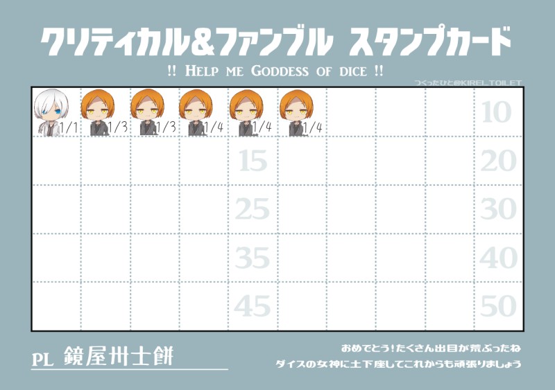 So-shi☆quiet followMEMOクリファンスタンプカード青がファンブルで赤がクリティカルお借りしてるメーカーはでふぉるめメーカー show all(+1 images) Tap to full screen (size:1240x874).Repost is prohibited Let's send reactions! freqpopularsnackothersPayment processing Replies from the creator Follow creator you care about!☆quiet follow So-shiMOURNINGよその子立ち絵と差分まとめ 13 So-shiSPOILERMAGNIFICAS 現行未通過❌2枚目以降ネタバレ 5 So-shiDOODLEA gift from the perishing world現行未通過❌ 4 So-shiMEMOロウの差分 10 So-shiDOODLE0BLIVI0N自探イメソンパロ絵なので一応現行未通過❌ 2 So-shiDOODLEREGlCiDE ネタバレ血液表現有り 4 recommended works マッチ血DONEマフィン 野うさぎDOODLE手元のフォルダにある画像でポイピクのテストしてると元気くんを大好きなやつみたいになるな! sakuraba_01DONEX2U/マフィア yagiMEMO二回目探索の時のキャラ、医者~急いで書いたので修正と、差分書きしたい⇒キャラシhttps://iachara.com/sns/218821/view⇨参加セッションマンホールの底 mermeimuPASTそして誰がいなくなるのか?HO4らくがき げんみ❌2020.0601 きりゅーDOODLE1月にやった傀逅セッションをまだ引き摺っています( ˇωˇ ) 5 しまざきDONE2020年生まれのメンバー。沢山作ったねえ…。塗り方、常に試行錯誤しているので統一感は無い。 ざくろろろろろろろろろろDOODLE久々にクトゥルフをリモートでやったら、主にRPのせいで自探索者がロストしました🤔シナリオは狂気山脈、HOは3B隠匿された真実「君を突き動かすのは好奇心だ」との記述から、好奇心旺盛命知らずお兄さんになりました(死因) 3 @キュマ/小熊奈津DONE雑誌風でまとめた千葉優晴のキャラシ