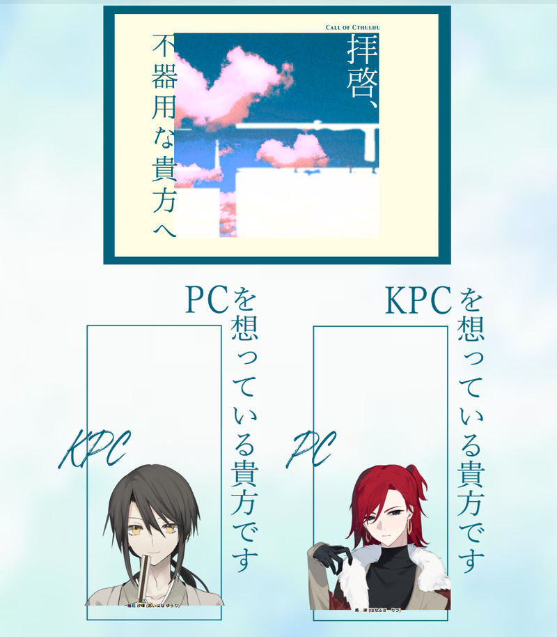kohaku_coc_☆quiet followPROGRESSCoC「拝啓、不器用な貴方へ」KPC: 相花 汐理/心花咲PC: 英 律/ぷねむっとさんエンド1 Tap to full screen (size:992x1134).Repost is prohibited Let's send reactions! freqpopularsnackothersPayment processing Replies from the creator Follow creator you care about!☆quiet follow kohaku_coc_PROGRESSCoC「煌煌」KP:かきあげさんHO金: パルジファルHO碧: クンドリHO輝: アーリンダルHO煌: アーダエンド3B「救済の詩編」 kohaku_coc_PROGRESSCoC「そうだ!餃子パーティーしようぜ!」KP/KPC: 榛原 瑠衣/yukiさんPC/PL: 水城 悠斗/心花咲 沖内 理匡/ひまねこまさん 夏白 菊治/ているさんシナリオクリア kohaku_coc_PROGRESSCoC「スーサイデッドメアリンク」KPC/KP: 薺野 光祐/心花咲PC/PL: 新月 奏真/とりまのレンさんエンドA kohaku_coc_PROGRESSCoC「確信的イナモラメント」KPC/KP: 雛菊 瑛翔/心花咲PC/PL: 應梦/ゆゆゆさんエンドB シナリオクリア kohaku_coc_PROGRESSCoC「ディアブルの祈り」KP: ナナセさんHO1尤:新月 奏真/とりまのレンさんHO2凡:薺野 光祐/心花咲エンド1 両生還 kohaku_coc_PROGRESSCoC「6号線4時44分発の」KPC/KP: 狐兄/ゆゆゆさんPC/PL: 紫鏡/心花咲シナリオクリア recommended works 畑耕しマンDOODLE単体❌ 16 null353DOODLEギルエマちょっとすけべ落書き nanacoDOODLEチビ時代のリハビリpass:sx 4 R_KanariaLoveDOODLE 7217 POI11241214DOODLEㅊㄹ드림 N41RDOODLE 6 ニットSPOILER今回の沼男についての感想(個人的なものが多め)当然のようにネタバレが含まれます。それでも大丈夫ならOKで。 1313 Uzki_nnnDONEレプリカントの葬列 HO1ウサギ-ファニーバニー kaku2tenDONE背景描きたくなって吹き出しもつけてみたくなってゲーム風にしてみた 3