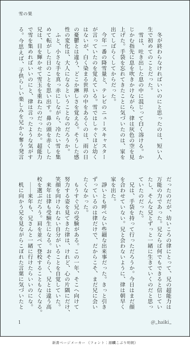 _haiki_☆quiet followDONE雪の果/モブ律兄さんの受験前にセンチメンタルになった弟と兄の包容力の話 show all(+3 images) Tap to full screen (size:618x1132).Repost is prohibited Let's send reactions! freqpopularsnackothersPayment processing Replies from the creator Follow creator you care about!☆quiet follow _haiki_DONE夜の天秤/いちじろ兄の日にちなんだはずがどこか辛気くさくなってまったいちじろ 4 _haiki_DONEChicken Dreams!/いちじろいちじろワンドロお題『鶏』で書かせていただきした!🐔2️⃣にずっと狂っていますたすけて 4 _haiki_DONE微睡むノスタルジア/いちじろいちじろワンドロ『◯◯しないと出られない部屋』で書かせていただきました! 4 _haiki_DONEそしてランドルトの環は閉じる/いちじろいちじろWebオンリーのお題企画、17歳×15歳で書かせていただきました!自分で眼を塞ぐ2️⃣の話です。ざっくり不穏 3 _haiki_DONE※死ネタ社会人になった律と同棲をしていた霊幻が、ある日事故で死んだ律の墓の前で色々考えたりする話 4 _haiki_DONE君もこの空を見たか/死ネタ明日のことを考えながら死ぬ律かわいそうという感じのリクでした 4 recommended works kok0ko_kok0koDOODLE■ミス田「要殿に余り馴れ馴れしくしないで貰えますか?👅」独占欲強めの三篠と、満更でも無い田沼くん。 black10kiaDONE⚠️局部は出てませんが裸体なので注意⚠️いつかに出されたaんaんの表紙ガチャを見て脳が焼かれた末に描いた“纏う色気”“魅了する人の秘密”の表紙ワスです。何度も「こんなのワスじゃない…!パリン!こんな顔ワスはしない……!!パリン!」などと、気難しい陶芸家のように描いては投げ、描いては投げを繰り返しここまできてしまいました。。。こちらで一旦ステイさせていただいて。これにて。 みかみREHABILI※腐 R-18 アロヴァン「素股」 鍵🔑18歳以上でBLに理解のある方ですか?「yes/no」 3 すいめんかDONEなだ愛3開催おめでとうございます!シャッフル企画のお題『共闘するジルアン』です。共闘ってこれで良かったのか不安😂 10 310(さとう)MEMO250212三島ぷち遠征‐2ぶたさんもいたよぉ昔の暮らしの道具もおもしろかったねおいしいものも食べたよ三島コロッケはお写真撮る前に食べ終わっちゃったラストは地元でのお疲れごはん楽しいぷち遠征でしたん 11 sanosano2332SPOILER⚠️CoC:Paranormal Crime 全話ネタバレ!立ち絵とネタバレイラスト🔑はシナリオで登場した「あの数字」 4 十雲 暁@蜘蛛宮 煉果DONE原神のアルハイゼンさん初めてちゃんと描いた✨ YonohitomiDOODLE 3 楽しいことしかないDONEえ?あたしはずっと責任を放棄するばかりだったから親に頼られてるとか思ったことないが、そうなの? 2