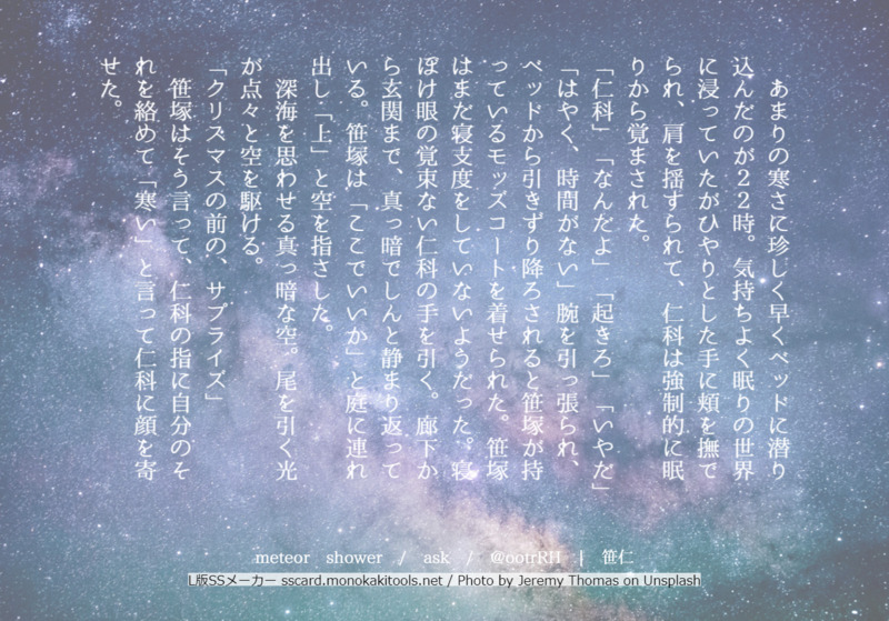 asaki☆quiet followDONE12/19 エアコレ用クリスマスカード雰囲気笹仁今年は12/13深夜から12/15未明くらいまでだったそうです。残念ながらアドベント笹仁は絶賛あんな感じなので、没案です ##笹仁 #笹仁 sasahito Tap to full screen (size:1365x954).Repost is prohibited Let's send reactions! freqpopularsnackothersPayment processing Replies from the creator Follow creator you care about!☆quiet follow asakiDONE浮葉様お誕生日おめでとうございます!誕生日なのに久々に不穏な二人になりました。 2405 asakiDONEメイド服を着るように強要された黒崎さんとカミュさんのえっちなお話。・攻の女装要素有・ガッツリめにいたしています・やまおちいみなし成人済み? y/n 5382 asakiMOURNING【蘭カミュ】触れ合いあの隙間から見えるソレは魅惑的だよね。前半は仲良しテットナイトです。 6 asakiMOURNING【蘭カミュ】知らない時間久々にタブナイに潜入したらどうしてもあの隙間に手を突っ込むカミュさんが頭から離れなかったので供養します。蘭カミュですが、カミュの攻勢強めです。 6 asakiMOURNINGハーフグローブとこの酷暑から着想珍しくド健全【大浮】熱熱、が――じわりと染みていく。 その間にある羅紗の羽織すら遮ることはできず、肌と肌の境界などありはしないというように。 (あぁ、どうして) それが嫌ではないのだと、気付いてしまったのだろう。 きっかけは何気ないことだった。 別のことに気を取られたまま階段の手すりに手をかけたところ、ハーフグローブがつるりと滑ったのだ。前のめりに落ちそうになるところを、背後にいた大我が浮葉の腕を掴んだ。ただそれだけのこと。 制服をきっちり着こなし、着物を羽織る浮葉には掴まれた腕の力強さしか分からなかったが――食い込む指先の感触だけは鮮明に覚えている。 大の男を一人支えるのにそれだけの力を要するのは当たり前で、浮葉は引き上げられた後にまじまじと大我の顔を見てしまった。 4485 asakiDONE付き合いたてのイチャイチャ会話をお楽しみ下さい。 2801 related works 紫垣🐠DONE笹仁/星空のアクアリウムOP.3 展示作品スタオケ加入後の二人のお話。ナチュラルに付き合ってます。※コンミス出ます『GRADATIONS』>#0「Colorless Color」#1,#2「Colored Notes」から続いている連作です。#4「One Identity」に続きます。like a FISH in water#3 昼下がりの練習室に、ヴァイオリンの耳慣れない旋律が流れる。耳慣れないも何も、初めて聴く曲なのだから当たり前なのだけれど。 譜面に目を落としながら、目の前で流れる曲に耳を傾ける。 普段ならばネオンフィッシュの曲として笹塚から渡される新曲は、新鮮な驚きの中にも、ああ笹塚の曲だなと思うような要素が多くある。もちろん、今目の前で演奏されている曲にその要素がまったくないとは言わないけれど、かなり珍しいタイプのアプローチの曲だ。そのメロディラインに聴き慣れたコンミスの音色が乗る。 アップテンポで軽快で、おもちゃ箱を開けたみたいな可愛らしい曲だ。短いけれど、曲の表情が豊かで満足度も高い。 譜読みの難易度が低くて、聴き映えがする曲。笹塚がコンミスの希望にきっちりと答えた曲だ。ピアノ演奏もコンミスの演奏ととても合っていて心地良い。 5686 asakiDONE1031は天才の日だそうで【笹仁】Dear My Prodigy ――笹塚創は天才だと誰もが言う。 (俺も、そう思う) その意見に否やはないが、作曲家・笹塚創という人物像は一人歩きしてしまっているところがある。 仁科が営業先で聞く天才笹塚のイメージはいくつかある。 よく聞くのは情緒、あれだけ繊細な曲を仕上げられるのはふくよかな感受性あふれた人であると言われている。 (空気は読めないし、情緒ゼロだけど。豊かな感受性ってのは正解) そう宣った映画のプロデューサーは、もちろん笹塚に会ったことなどない。的を得ているなと思う反面、笹塚を妖精かなんかだと思っているのかというくらい繊細な人物だと思い込んでいた。理由は直接会いたいという要望をにべもなく断っていたからだろう。加えて、仁科が「人と会うのは得意じゃない」とフォローを入れたのがまずかったか。 2056 紫垣🐠DONE笹仁/星空のアクアリウムOP.3 展示作品スタオケ加入後の二人のお話。ナチュラルに付き合ってます。※R18はつけていないですが、行為が匂わされる表現があったり、甘めだったりするので苦手な方はご注意ください。『GRADATIONS』>#0「Colorless Color」#1,#2「Colored Notes」#3「like a FISH in water」から続いている連作です。One Identity#4 素肌の背の下に敷かれた固いシーツに大きく皺が寄った。 菩提樹寮の笹塚の部屋に備え付けられた簡素なベッドに両手首を押さえつけられ、半身で乗りかかられるような形で、もうどの位の時間が経ったのだろう。西日が射しこみ、夕暮れの赤い光が眩しく室内を満たす中、呼吸まで浚うような長いキスをずっと施され続けていた。 覆いかぶさった熱。身長は俺と同じはずなのに、がっちりとした恵まれた体格を存分に生かし、その腕の中にいともたやすく全身を閉じ込められてしまう。 二つの唇