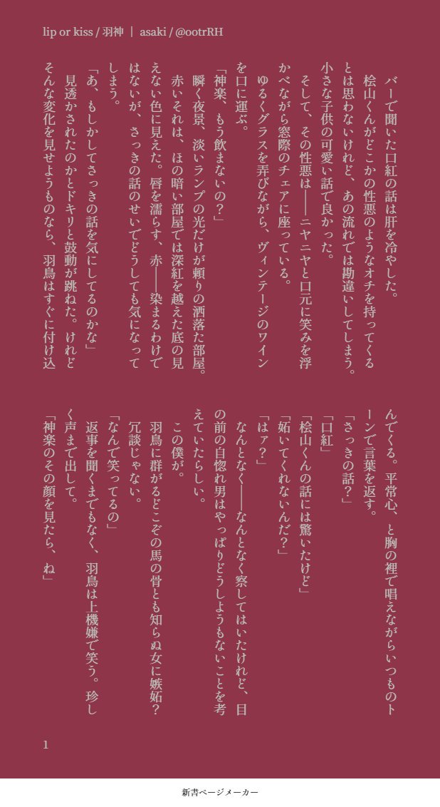 asaki☆quiet followMOURNINGすべてはミニトークのせい支部にもあるよ ##はとかぐ #羽神 godOfWings #はとかぐ dovecote show all(+2 images) Tap to full screen (size:618x1132).Repost is prohibited Let's send reactions! freqpopularsnackothersPayment processing Replies from the creator Follow creator you care about!☆quiet follow asakiDONE浮葉様お誕生日おめでとうございます!誕生日なのに久々に不穏な二人になりました。 2405 asakiDONEメイド服を着るように強要された黒崎さんとカミュさんのえっちなお話。・攻の女装要素有・ガッツリめにいたしています・やまおちいみなし成人済み? y/n 5382 asakiMOURNING【蘭カミュ】触れ合いあの隙間から見えるソレは魅惑的だよね。前半は仲良しテットナイトです。 6 asakiMOURNING【蘭カミュ】知らない時間久々にタブナイに潜入したらどうしてもあの隙間に手を突っ込むカミュさんが頭から離れなかったので供養します。蘭カミュですが、カミュの攻勢強めです。 6 asakiMOURNINGハーフグローブとこの酷暑から着想珍しくド健全【大浮】熱熱、が――じわりと染みていく。 その間にある羅紗の羽織すら遮ることはできず、肌と肌の境界などありはしないというように。 (あぁ、どうして) それが嫌ではないのだと、気付いてしまったのだろう。 きっかけは何気ないことだった。 別のことに気を取られたまま階段の手すりに手をかけたところ、ハーフグローブがつるりと滑ったのだ。前のめりに落ちそうになるところを、背後にいた大我が浮葉の腕を掴んだ。ただそれだけのこと。 制服をきっちり着こなし、着物を羽織る浮葉には掴まれた腕の力強さしか分からなかったが――食い込む指先の感触だけは鮮明に覚えている。 大の男を一人支えるのにそれだけの力を要するのは当たり前で、浮葉は引き上げられた後にまじまじと大我の顔を見てしまった。 4485 asakiDONE付き合いたてのイチャイチャ会話をお楽しみ下さい。 2801 related works asakiMOURNINGすべてはミニトークのせい支部にもあるよ 3 asakiMOURNINGすべてはミニトークのせい支部にもあるよ 3 asakiMOURNINGはとかぐに芽生えたころ 3 asakiMOURNING羽鳥はこういう男だって思ってる asakiMOURNINGはとかぐに芽生えたころ 3 asakiMOURNING付き合ってるのかないのか asakiMOURNING付き合ってるのかないのか asakiMOURNING羽鳥はこういう男だって思ってる recommended works asakiMOURNINGすべてはミニトークのせい支部にもあるよ 3 asakiMOURNING羽鳥はこういう男だって思ってる asakiMOURNINGはとかぐに芽生えたころ 3 asakiMOURNING付き合ってるのかないのか Boukun0214MENU同人誌のサンプルです。サンプル分はえっちシーンないですが本文にはガッツリあります。 10 xiangchikaoyaDOODLE小甜心×2 2 はちみつDONE天フェス用に描いていた作品の続きです途中までです 何でも許せる方のみです成人以上の方限定ですメディアミックスです成人済みですか? 5 さざきSPOILERならび最終話二日目エグかった…ネタバレ注意 hzzzzzyiiiDONE【いくじなし】+60min遅刻参加失礼します!