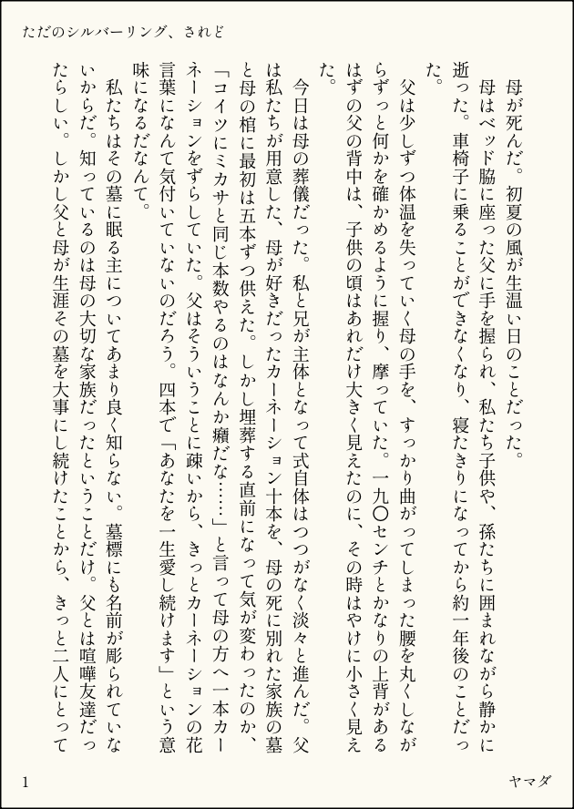 𓆟ヤマダ𓆟☆quiet followDONEジャンミカ書き殴りの一発屋です。はじめまして。テーマが「指輪」の掌編全6ページです。原作軸で二人の娘視点かつミカサの葬式の話とかいうラブコメ要素カケラもない話かつ若干エレミカ要素もあるのでご注意ください。指輪を巡ってミカサが珍しく心理戦でジャンに勝つ話です。 show all(+5 images) Tap to full screen (size:630x888).Repost is prohibited Let's send reactions! freqpopularsnackothersPayment processing Replies from the creator Follow creator you care about!☆quiet follow 𓆟ヤマダ𓆟PROGRESSBBB再録本のノベルティシールとかの絵の置き場シール詰め合わせはシークレット1枚追加して13枚になりました梱包用に作ったパターンもここに置いておきます 16 𓆟ヤマダ𓆟DONE「花曇」https://poipiku.com/1058318/11153524.htmlの続きのようなスミがイサの髪を船の上で切るアフストに出てきた話の詳細を勝手に幻覚見て書いた短編(全17ページ)です。スミが脳内ブレとギャイギャイしつつ真剣にイサの髪を切るスミイサ(ブレイサ)話です。もし読んだら軽い気持ちでかわいいスタンプとか押してもらえると嬉しいです。 17 𓆟ヤマダ𓆟DONE「Aurora」みらルルから60年後、ミユの終活と二人の墓守と再び目覚めた未来戦士の話(全36ページ)。スミ(ブレ)イサは香る程度です(イサが亡くなっている世界なので)。死ネタだしキャラが老いてるし世界観も殺伐としているので本当にご注意ください。もし良ければ読んだ方いたら軽い感じでかわいいスタンプ押してもらえると嬉しいです。マシュマロ感想も喜びます。 36 𓆟ヤマダ𓆟DONE「一歳差チョコレートパニック」スミスの26歳の誕生日を祝うためにイサとルルちがブラウニー焼いたりヒビミユヒロタチョがクッソまずい伝説のチョコレート作ったりイサが実は歳上だったスミにうわーってなったりする話(全17ページ)。当然のようにスミイサがくっついてるしイチャついています。もし良ければ読んだよ!って軽い感じでかわいいスタンプ押してもらえると嬉しいです。マシュマロ感想も大歓迎です。 17 𓆟ヤマダ𓆟DONE「誰が落とした比翼の鳥」スミスを失った後のルルちとイサミメインでルルちを気にかけるブレがちょっと出てくる10話軸のバッドエンドに繋がる話です。スミスの誕生日前日に書く話ではない。本当に申し訳ない。書き手がスミイサ(ブレイサ)推しなのでもしかしたら推しcpが滲んでいるかもしれない。もし良ければ読んだよって感じで適当にかわいいスタンプとか押してもらえると私が喜びます。マシュマロ感想も大歓迎です。 11 𓆟ヤマダ𓆟DONE「Lulu」ルルちの名前についてあれこれ考えたスミスがイサミと2人でヒビキの助けを借りながらルルちに改めて「ルル」という名前を贈る話(全14ページ)です。時間軸はアフスト後をイメージしております。書き手のルルち大好きの気持ちと推しcpであるスミイサがだいぶ香ります。ご注意ください。もし良ければかわいいスタンプ押してくれたら嬉しいです。マシュマロ感想も喜びます。 14