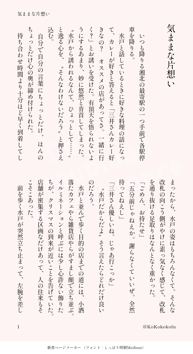 KoKokokofu☆quiet followPAST「気ままな片想い」ワンドロ企画 12/1〜12/7『冬服 寒がり 温め合う 待ち合わせ イルミネーション』分まだ付き合ってない二人イメソン:カ/ント/リー/・ガー/ルズ『気ままな片想い』 show all(+6 images) Tap to full screen (size:618x1132).Repost is prohibited Let's send reactions! freqpopularsnackothersPayment processing Replies from the creator Follow creator you care about!☆quiet follow KoKokokofuDONE「除夜の鐘はもう響かない」ワンドロ企画 12/29〜1/4『寒がり 除夜の鐘』分初詣に軍団と行く洋平の話「嘘も方便って言うだろ?」の続き 5 KoKokokofuDONE「全部お前のせい」ワンドロ企画 1/3『寝正月』分同棲してる二人 21ちゃいと23ちゃい⚠️ガッツリ事後 3 KoKokokofuDONE「運任せじゃねえ」ワンドロ企画 12/29〜1/4『運任せ』分とワンドロ企画 1/1『願い事』分なんなのさん(@honmani_nannano)の↓のツイーヨの設定に滾って書きましたhttps://x.com/honmani_nannano/status/1874213891326304709?t=a7D-qwO1YRJdG8oFUQL5WQ&s=19 6 KoKokokofuDONE「幸せの温度」「幸せの名残」の続き19ちゃいと21ちゃいの12/28〜12/29のお話⚠️未成年飲酒の描写がありますが、作者はこれを推奨する意図はございませんお酒は二十歳になってから 10 KoKokokofuDONE「幸せの名残」ワンドロ企画 12/31『幸せ』分大掃除してたら洋平のこと考えちゃう三井さんのお話洋平は回想だけ出てくる。19ちゃいと21ちゃい⚠️読む人をぜっっっったいに選ぶ話です。が、注意書きはネタバレを含むので改行した下の方に書きます。死ネタではありません。喧嘩別れしている洋三。続きの話(幸せの温度)で必ずハピエンになります。なぜなら私がハピエン厨だから 4 KoKokokofuDONE「意気地なし」ワンドロ企画 12/30『踏切』分洋三の両片想いってやつ古代から煎じられてきたであろうパターンを私も煎じてみたかったんです……。 4 recommended works 紅のルコDOODLE 13 momosodateDOODLE身体の練習をしたかっただけなのになぜこうなった色気ないけど一応最中なのでパスワードで…洋三です18↑ y/n 2 歩/零TRAININGhttps://poipiku.com/3231663/8692803.htmlの話の続きですが、よくあるなんちゃらオチ的な内容です。前回の話の終わり方でおしまいにしたいという方は無理して読まなくても問題ありません。なんちゃらオチだからってハピエンではないので、なんでも大丈夫な人向けです。超余談ですが、お題を見た時に先にこのオチのほうを思いついていて、メインはそこから遡って考えました。 931 syakedaikon0DONE洋三ワンライお題「意気地なし」グダグダ考えるタイプの二人のカッコ悪い告白話です 3449 syakedaikon0DONE洋三 お題「ケーキ」誕生日限定アクシデント体質の三が、洋を巻き込む話 7367 syakedaikon0DONE洋三 お題「ビニール傘」相合い傘がしたくてたまらない両片思い洋三の話 4484 YHY_1baninDOODLE성공률 100%! 정대만이 뭘 죽어도 허락 안 해줄때 쓰는 양군의 필살기양호열이...여장?하고... 끼를? 부립니다...대만이는 안나오지만 호열대만입니다...근데 호댐러이실수록 안 괜찮으실 거 같아요......정말저엉~~~말 뭐든지 다 괜찮으신 분만...PW: OK? (y/n) 歩/零DOODLE第7回のお題「紫陽花/ビニール傘」お借りしました。時間ができたので今更ですが書かせて頂きました。893×プロ選手。大真面目ではありますが、水戸がじゃっかんstkチックかもしれません。文字数足りないので詳しくはこっちのキャプションで→https://www.pixiv.net/novel/show.php?id=20446860PASS:18over?「y/n」 7702 しおんDONE洋三ワンドロお題【宿題】で参加させていただきました!2人はラブラブ、てワケ