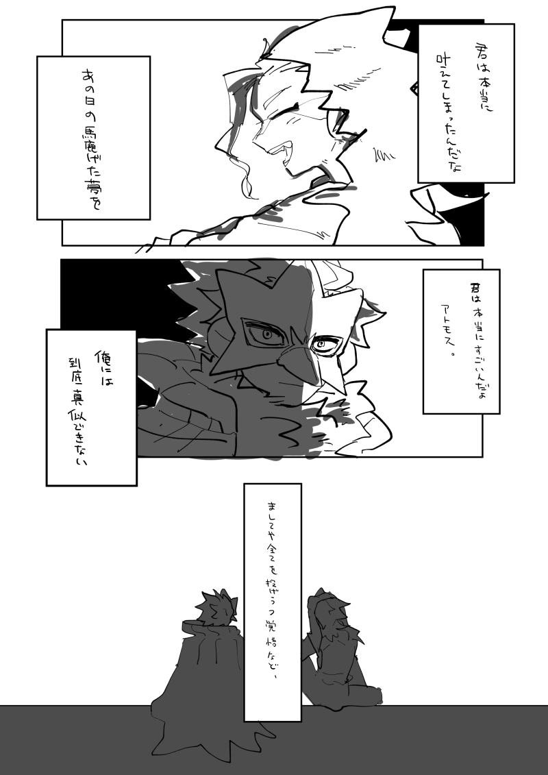 アトモス(ゴリランダー♂)とダージ(アーマーガア♂)の漫画恥ずかしいのでこっちに載せます。ダージは夢を叶えて楽しく生きてるアトモスが羨ましくて仕方ないけどあれはアトモス自身が頑張ったからこそ叶った夢だし自分にはその行動力も勇気もないしとやかく言える立場じゃないなみたいなアレです