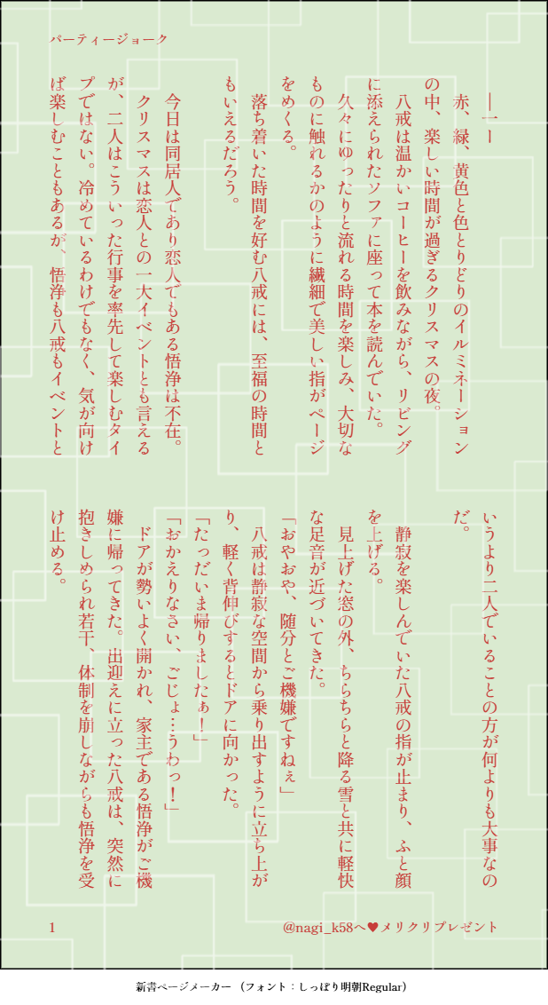 nagi_k58☆quiet followDONE【浄八】挿絵入れて完成しました!文字書きの友人から、私へのクリスマスプレゼントで浄八小説が届いたのでUP。しかし、なぜか私への仕打ちが鬼畜で…友人の私いじりの箇所は力の限り見なかったことに!スルースキル全開にしていただけると助かります。 #58 #浄八 show all(+16 images) Tap to full screen (size:618x1132).Repost is prohibited Let's send reactions! freqpopularsnackothersPayment processing Replies from the creator Follow creator you care about!☆quiet follow nagi_k58PROGRESSポリネシアン3日目は「濃厚なキス解禁(つまりディープ)」なので、めっちゃちゅっちゅちゅっちゅしまくる…入りの部分をサンプルでどーぞ! 9 nagi_k58MAIKING左手は過去の運気、右手はこれから先の運気…らしいです生命線。。。最初、右と左を描き間違えて、全修正しました💦時間かかっちゃったなぁ・・・申し訳ない💦 3 nagi_k58DONE【黒大豆:浄八】マフィア風な2人のパロ。くじありがとうございます!!新規絵ありがとうございます!!!からの勢いで描きました✨お互いの執着と共依存を存分に描けて楽しかったです。TLにUPしたのをまとめました。こっちの方が多分、見やすい(゚д゚)(。_。)ウン 11 nagi_k58DOODLE大学生風浄八ということは・・・付き合い始めのこんなうぶな浄八を58作品見れるという認識であっているだろうか。。。お待ちしています!!!病院前なので、ささっと描いたので雑です💦 2 nagi_k58MAIKING側近用・・にょた8 4 nagi_k58DONE【湯記長編:2話】After the tears...②完結です!体を壊してしまい、更新が遅くなってしまって申し訳ありませんでした💦また、これから原稿期間に入るため、更新がしばらく先となります。原稿が早く終わったら早めに着手しますので、よろしくお願いいたします><💦 10 related works nagi_k58DOODLE【浄八イラスト集②】すっかり🍦が8の🍒に垂れたのを舐めている5の落書きを出すといって忘れておりました・・・そこまでEROではないので表でいいかな~(゚д゚)(。_。)ウン 6 nagi_k58DONE【浄八】挿絵入れて完成しました!文字書きの友人から、私へのクリスマスプレゼントで浄八小説が届いたのでUP。しかし、なぜか私への仕打ちが鬼畜で…友人の私いじりの箇所は力の限り見なかったことに!スルースキル全開にしていただけると助かります。 17 nagi_k58INFO【2月14日応募締め切り】フォロワーさんに感謝を込めて抽選会の景品が出そろいました!応募は私のXホームにクリップしてあるツイートをRPで完了です✨応募締め切りは明日までとなりますー!よろしくお願いいたします。 19 nagi_k58DONE【浄八】パーティージョークアダルトの裏編です。前〇腺責め、トコ〇テンぶっかけ、大人の玩具、結〇攻めなどを含むため、完璧にR18です。KWは裏アカウントでのみ公開します。年末年始のお供に。。来年もよろしくお願い致します! 30 nagi_k58DONE【エロ絵置き場】軍服8で着衣乱れという内容をシミ―ズ一行の先輩方からいただいたので(´∀`)配色手帳からエレガントローズ。せっかくの性癖お題だったので少し性癖足しました。・ずれた眼鏡(天を彷彿させるよう黒ぶち)・盛ったおぱーいPWは浄八の数字+私の誕生日です※18歳未満の方の閲覧はお控えください nagi_k58PROGRESSせっかくなんで悟浄さんも。八戒と違い、服を着ていないのでベタの×マークがないwwwwこの後の八戒さん、ベタが多くて×印だらけでぼろぼろに見える(笑) 81 you_kotoura ことDOODLEすーぐ飲もうとしちゃう8に5がだーから飲むなーってやって欲しいだけなんです。んぐぐ8。 nagi_k58DONE【湯記長編】序章(1話UP3月1日予定)序章部分とキャラ設定です。基本は湯記の世界観の中で動き、浄八がくっつくまでのストーリーです。ただ、天蓬と捲簾に過去の記憶があるので少し違った雰囲気でお届けできればなと思います。序章を見て苦手な方は回れ右で💦次回更新、1話は悟浄の過去編から入ります。3月1日UPを目指して頑張りまっす!!! 6 nagi_k58DOODLE【浄八イラスト集】パパっと描いたり、素敵な作品に添えさせて頂いたりです。イラストはこちらにまとめますー! 6