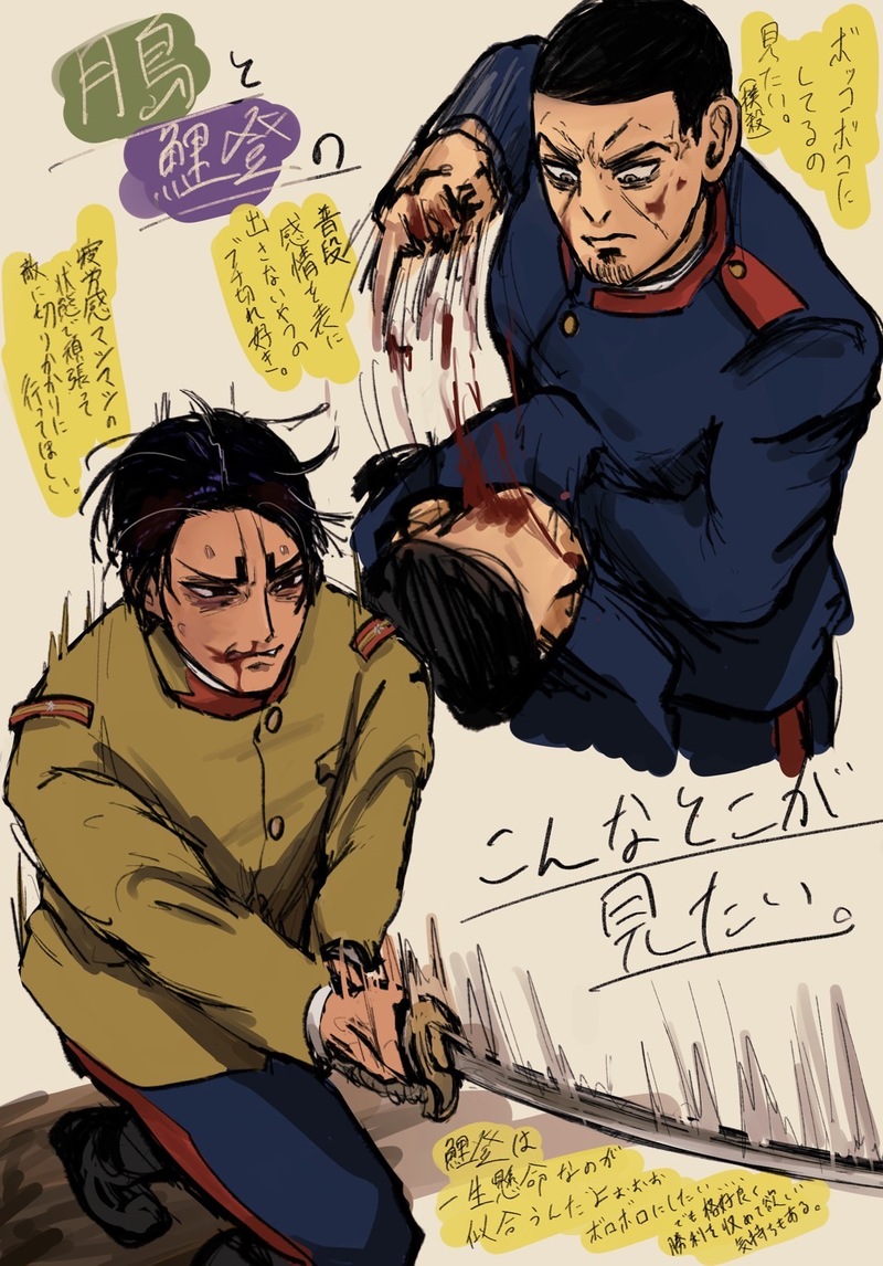 月島ってブチギレてるとき、正直カッコ良すぎるんだよな。鯉登はボロボロになりながらもひたすらに敵に立ち向かって欲しい。