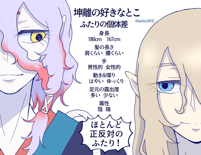 離さんのえちおね♂とそれにどぎまぎするうぶ坤ちゃんをなかなか上手く描けず、原点に立ち返って坤離を好きになった経緯を考えてみたら「薬売りさんって他にもいるの!?」→「ふたりともタイプ真逆な感じする!仲良くしてたら嬉しいな」→「元気な坤ちゃんとえちおね離さんってこと!?」とい経緯でした
