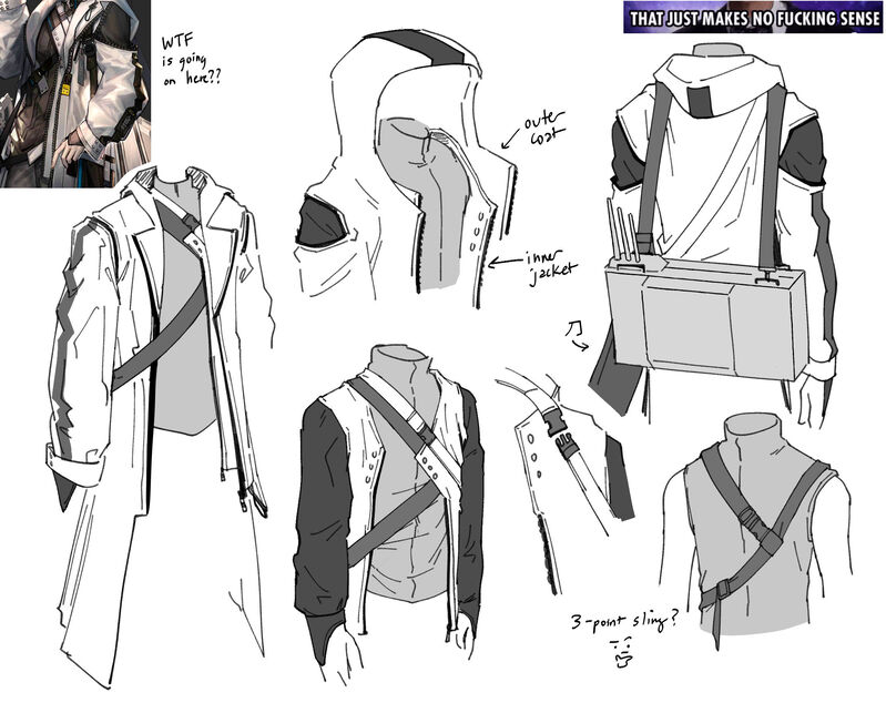 my attempts to make sense of arknights "just put a coat and random straps on everyone" design philosophy. Unless his sheet shows up in the 3rd anni artbook lel